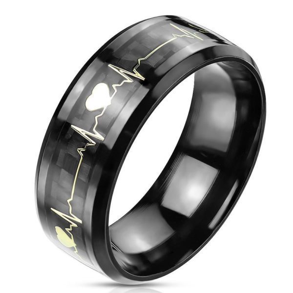 Hochwertiger schwarzer Edelstahlring mit goldendem 3-D Herzschlag Kardiogramm fuer Damen und Herren