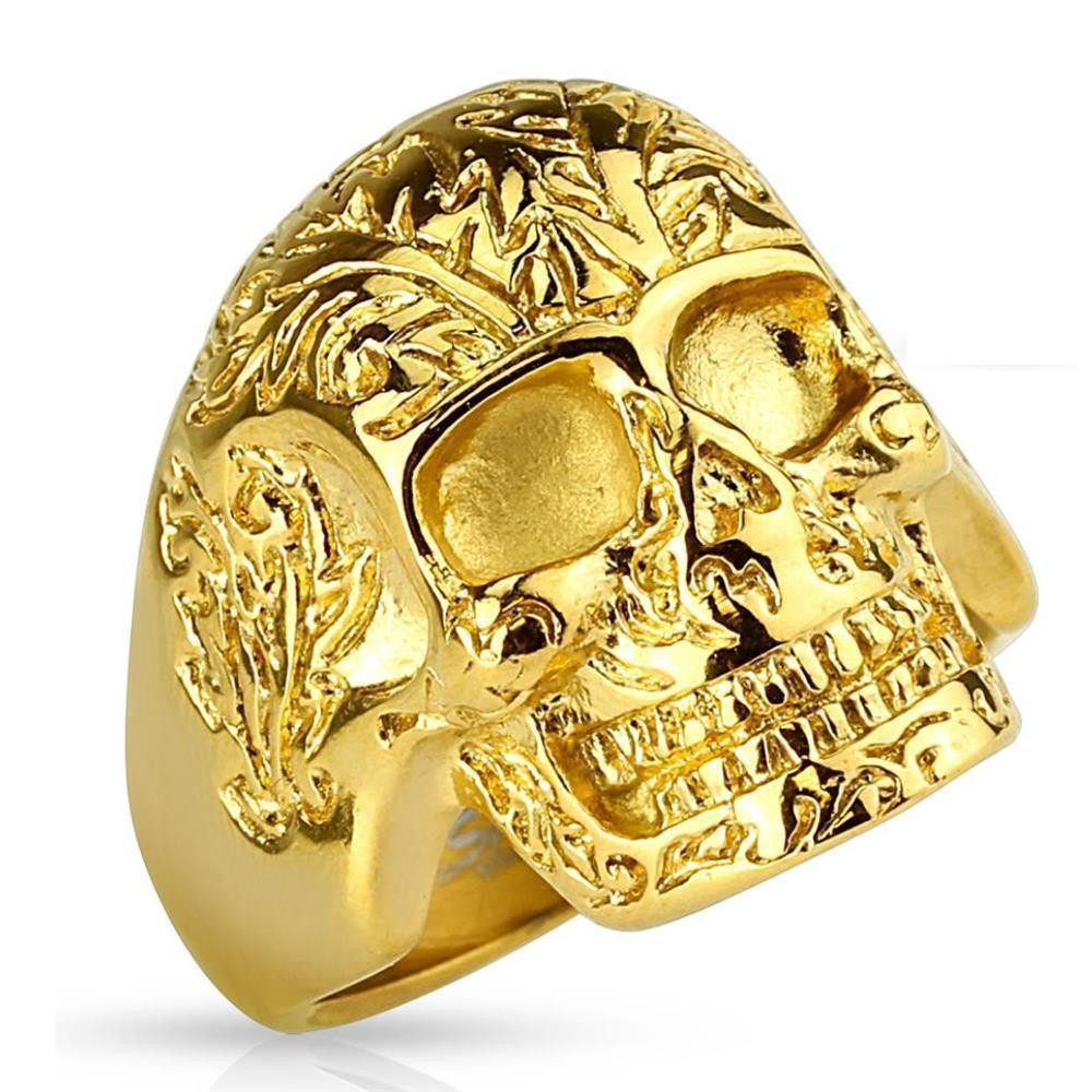 Skull Totenkopf Edelstahlring in gold – sehr aufwaendig mit floralem Muster verziert – massiv gearbeitet – ein toller Fingerring fuer echte Maenner