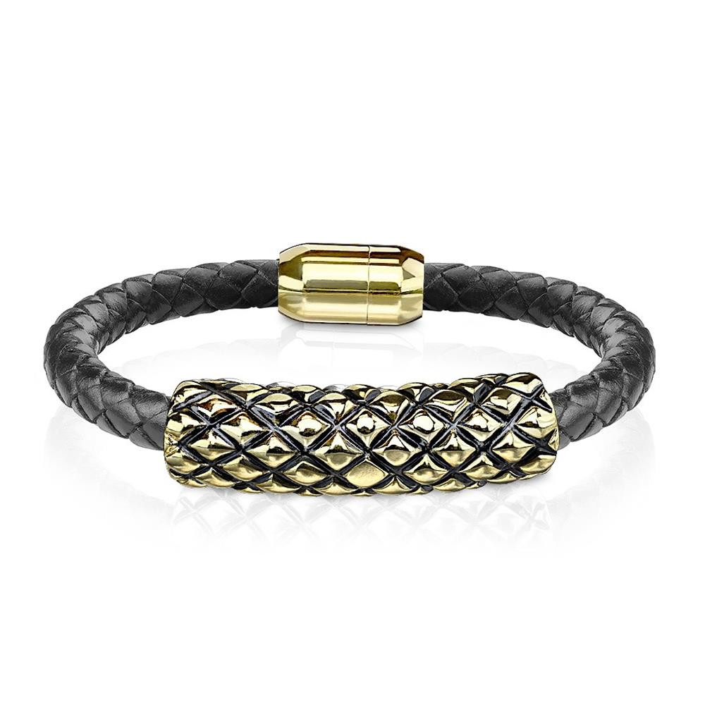 schwarzes Leder-Armband mit goldender Edelstahl-Roehre im Rauten-Design und Magnetverschluss
