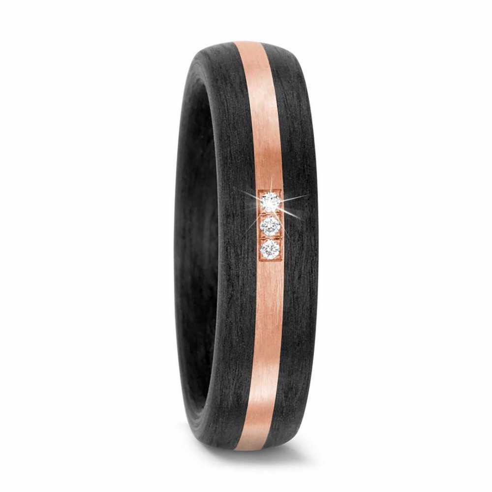Ringmodell: 59318/003/002/N556 Marke: Titanfactory Ringmaterial: 585/14 K ROSEGOLD, CARBON Ringmaterial: massiv Ringbreite Dame: ca. 6,0 mm Oberflaeche: mattiert Steinbesatz im Damenring: Diamant Steinform: rund Steinanzahl: 3 Steingroesse: 0,007 W/SI Gravur: innen Damenringgroessen: 50 bis 68mm (nur in 2er Schritten verfuegbar) Lieferumfang: 1x Damenring und gratis Etui Â