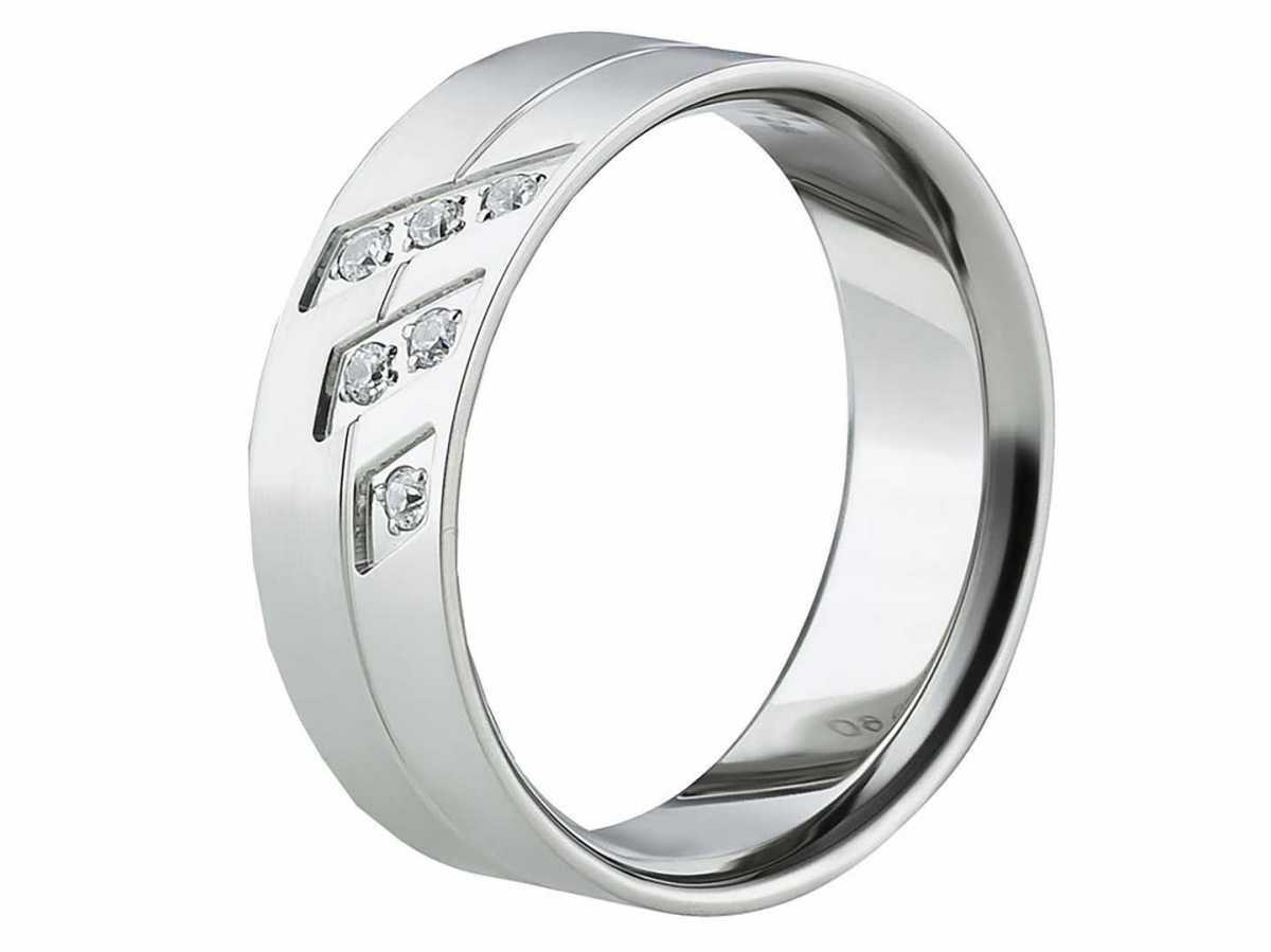 Ringmodell: AB1008 Marke: Mabro Ringmaterial: Edelstahl Ringmaterial massiv: JA Ringbreite Dame: ca. 7,0 mm Steinbesatz im Damenring: Zirkonia Steinform: rund Steinanzahl: 6 Steingroesse: ca.1,5mm Oberflaeche: Gebuerstet und Poliert Oberflaeche innen: Poliert Innen: bombiert (abgerundet) Damenringgroessen: 50 bis 62mm (nur in 2er Schritten verfuegbar) Lieferumfang: 1x Damenring und gratis Etui Â