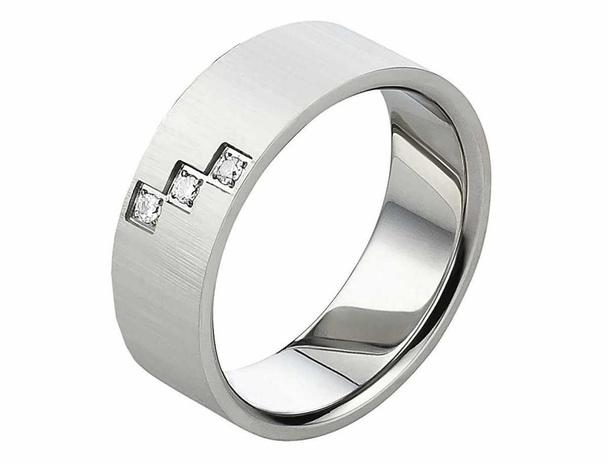 Ringmodell: AB1010 Marke: Mabro Ringmaterial: Edelstahl Ringmaterial massiv: JA Ringbreite Dame: ca. 7,0 mm Steinbesatz im Damenring: Zirkonia Steinform: rund Steinanzahl: 3 Steingroesse: ca.1,5mm Oberflaeche: Gebuerstet Oberflaeche innen: Poliert Innen: bombiert (abgerundet) Damenringgroessen: 50 bis 62mm (nur in 2er Schritten verfuegbar) Lieferumfang: 1x Damenring und gratis Etui Â