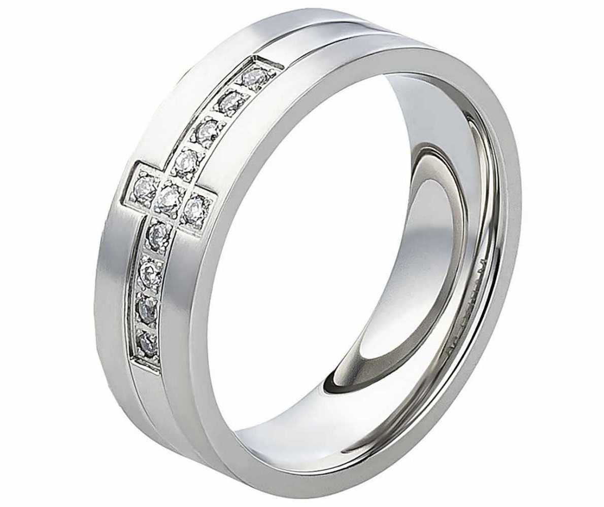 Damenring aus Edelstahl mit Kreuz Wuderschoener Damenring mit einen Kreuz aus Zirkonias mit einer schoenen Innengravur. Ringmodell: AB834 Marke: Mabro Ringmaterial: Edelstahl Ringmaterial massiv: JA Ringbreite Dame: ca. 5,2 mm Steinbesatz im Damenring: Zirkonia Steinform: rund Steinanzahl: 11 Steinform: rund Steinanzahl: 1 Steingroesse: ca.1,5mm Oberflaeche: Gebuerstet und Poliert Oberflaeche innen: Poliert Innen: bombiert (abgerundet) Damenringgroessen: 50 bis 62mm (nur in 2er Schritten verfuegbar) Lieferumfang: 1x Damenring und gratis Etui Â