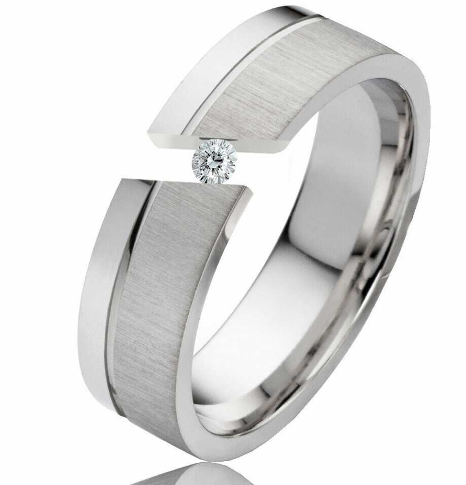 Damenring Spannfassung und Stein Edelstahl DE036 Ringmodell: DE036 Marke: Rings-and-More Ringmaterial: Edelstahl Ringmaterial massiv: JA Ringbreite Dame: ca. 6mm oder 8mm Steinbesatz im Damenring: Zirkonia Steinform: rund Steinanzahl: 1 Steingroesse: ca.2,75mm Oberflaeche: Poliert und Gebuerstet Oberflaeche innen: Poliert Innen: bombiert (abgerundet) Damenringgroessen: 47 bis 72mm (nur in 2er Schritten verfuegbar) Lieferumfang: 1x Damenring und gratis Etui Â