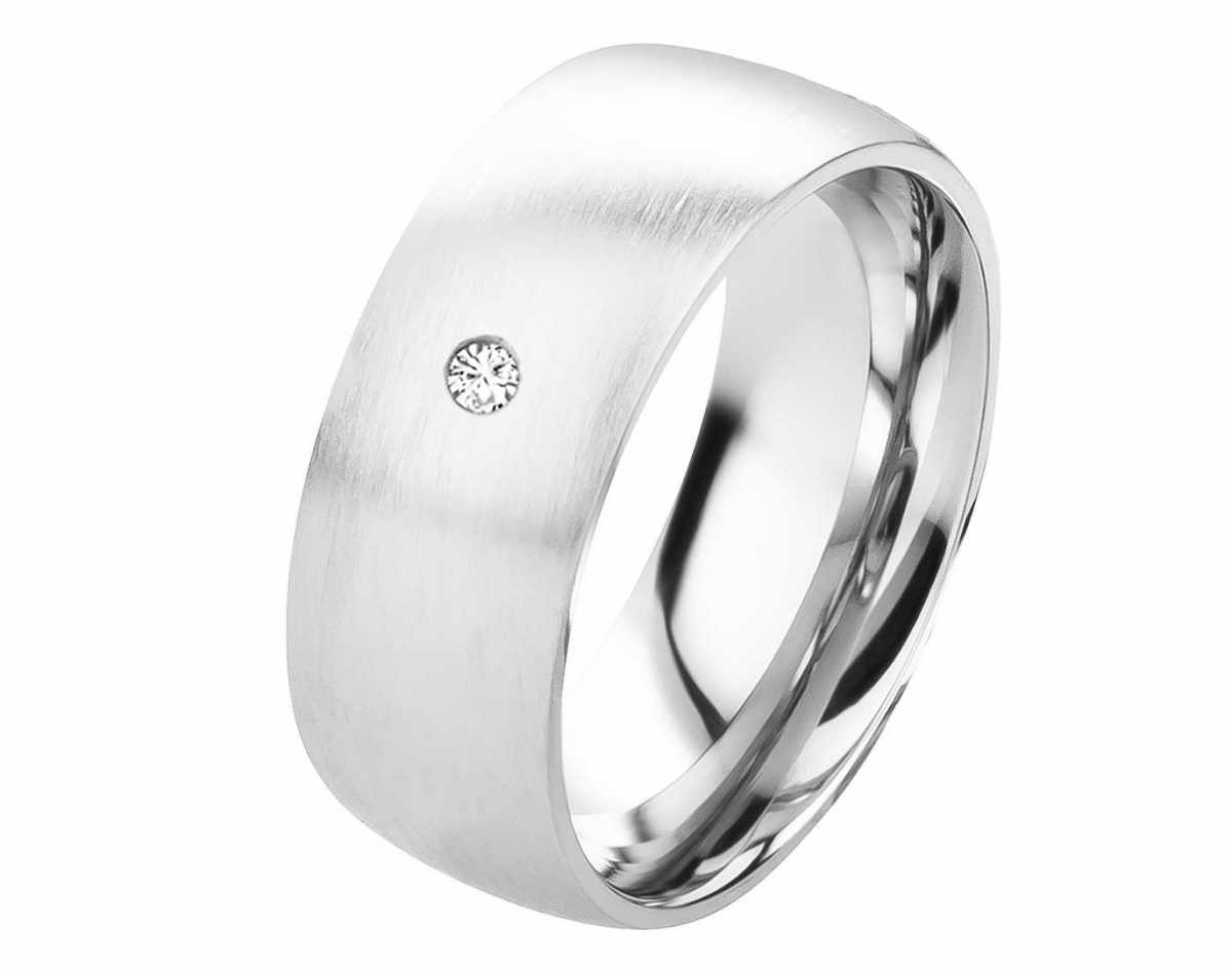 Ringmodell: DDE094 Marke: Rings-and-More Ringmaterial: Edelstahl Ringmaterial massiv: JA Ringbreite Dame: ca. 8,0 mm Steinbesatz im Damenring: Zirkonia Steinform: rund Steinanzahl: 1 Steingroesse: ca.1,5mm Oberflaeche: Gebuerstet Oberflaeche innen: Poliert Innen: bombiert (abgerundet) Damenringgroessen: 47 bis 72mm (nur in 2er Schritten verfuegbar) Lieferumfang: 1x Damenring und gratis Etui Â