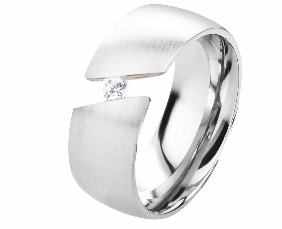 Ringmodell: DE097 Marke: Rings-and-More Ringmaterial: Edelstahl Ringmaterial massiv: JA Ringbreite Dame: ca. 8,0 mm Steinbesatz im Damenring: Zirkonia Steinform: rund Steinanzahl: 1 Steingroesse: ca.2,5mm Oberflaeche: Gebuerstet Oberflaeche innen: Poliert Innen: bombiert (abgerundet) Damenringgroessen: 47 bis 72mm (nur in 2er Schritten verfuegbar) Lieferumfang: 1x Damenring und gratis Etui Â