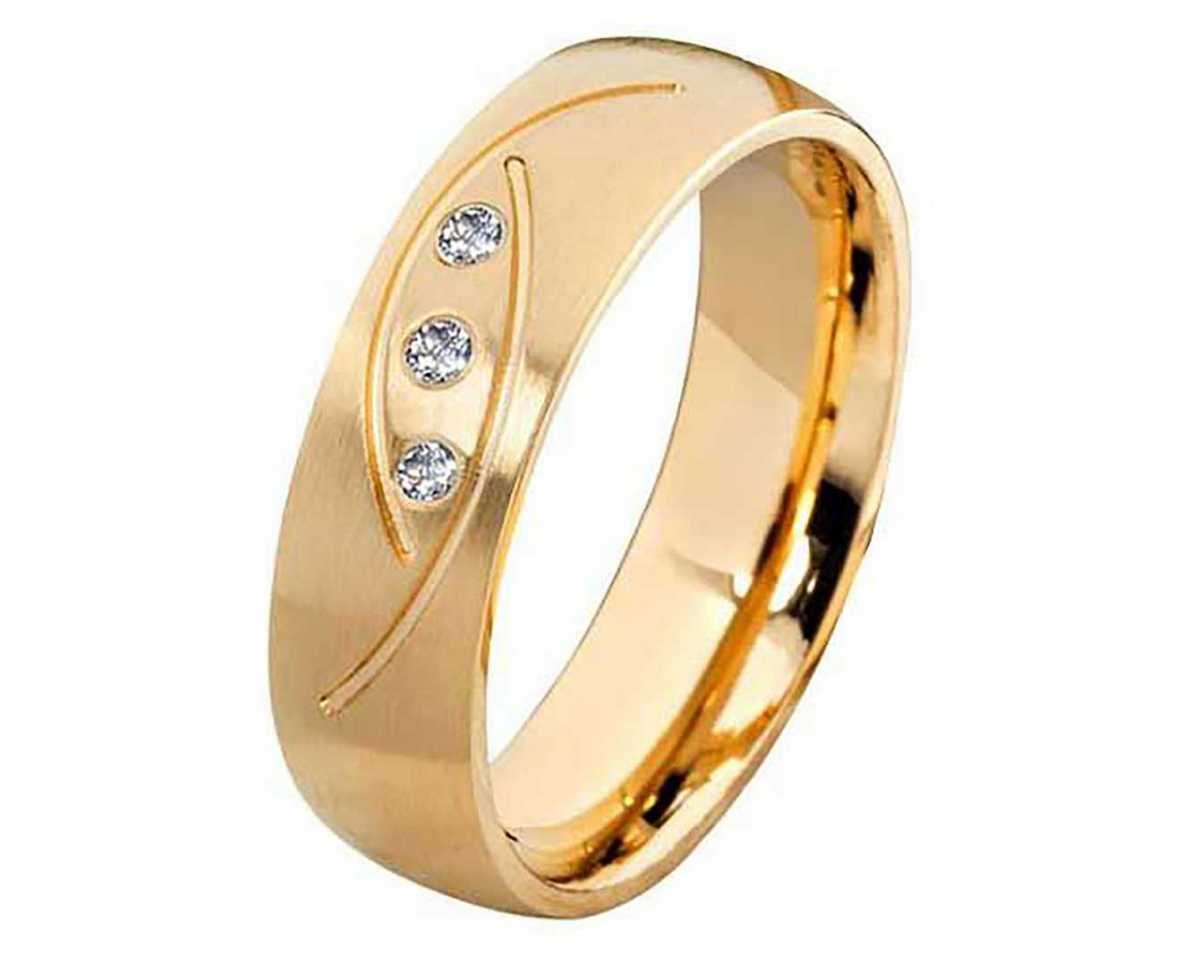 Ringmodell: DE106 Marke: Rings-and-More Ringmaterial: Edelstahl Beschichtet: goldfarbig Ringmaterial massiv: JA Ringbreite Dame: ca. 6,0 mm Steinbesatz im Damenring: Zirkonia Steinform: rund Steinanzahl: 3 Steingroesse: ca.1,5mm Oberflaeche: Gebuerstet Oberflaeche innen: Poliert Innen: bombiert (abgerundet) Damenringgroessen: 50 bis 58mm (nur in 2er Schritten verfuegbar) Lieferumfang: 1x Damenring und gratis Etui Â