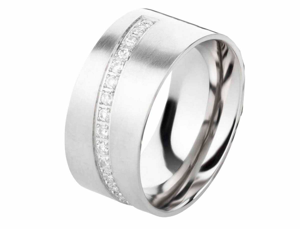 Ringmodell: DE127 Marke: Rings-and-More Ringmaterial: Edelstahl Ringmaterial massiv: JA Ringbreite Dame: ca. 10mm Steinbesatz im Damenring: Zirkonia Steinform: rund Steinanzahl: 24 Steingroesse: ca.1mm Oberflaeche: Gebuerstet Oberflaeche innen: Poliert Innen: bombiert (abgerundet) Damenringgroessen: 47 bis 60mm (nur in 2er Schritten verfuegbar) Lieferumfang: 1x Damenring und gratis Etui Â