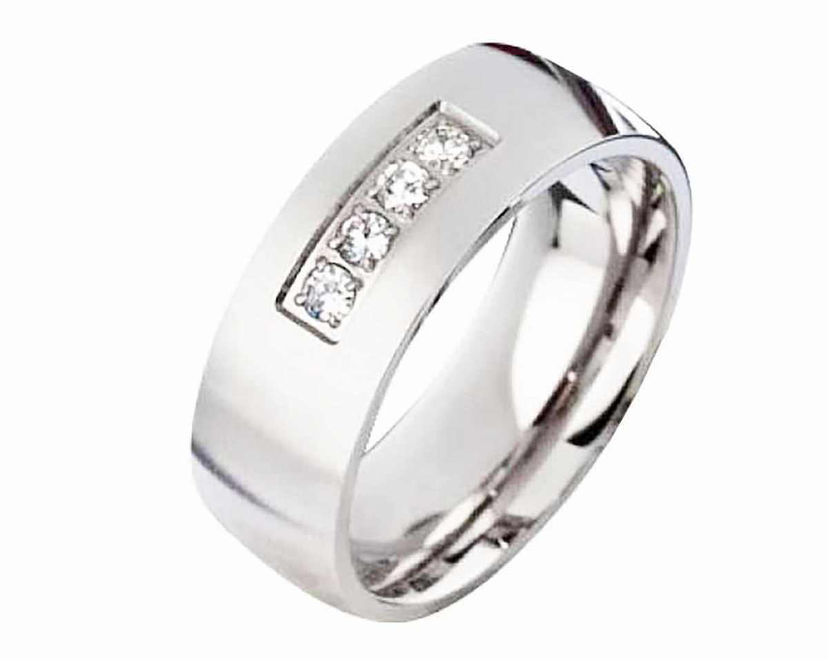Ringmodell: DE144 Marke: Rings-and-More Ringmaterial: Edelstahl Ringmaterial massiv: JA Ringbreite Dame: ca. 8,0 mm Steinbesatz im Damenring: Zirkonia Steinform: rund Steinanzahl: Steingroesse: ca.2 mm 4 Stueck Oberflaeche: Gebuerstet Oberflaeche innen: Poliert Innen: bombiert (abgerundet) Damenringgroessen: 50 bis 56 Lieferumfang: 1x Damenring und gratis Etui Â