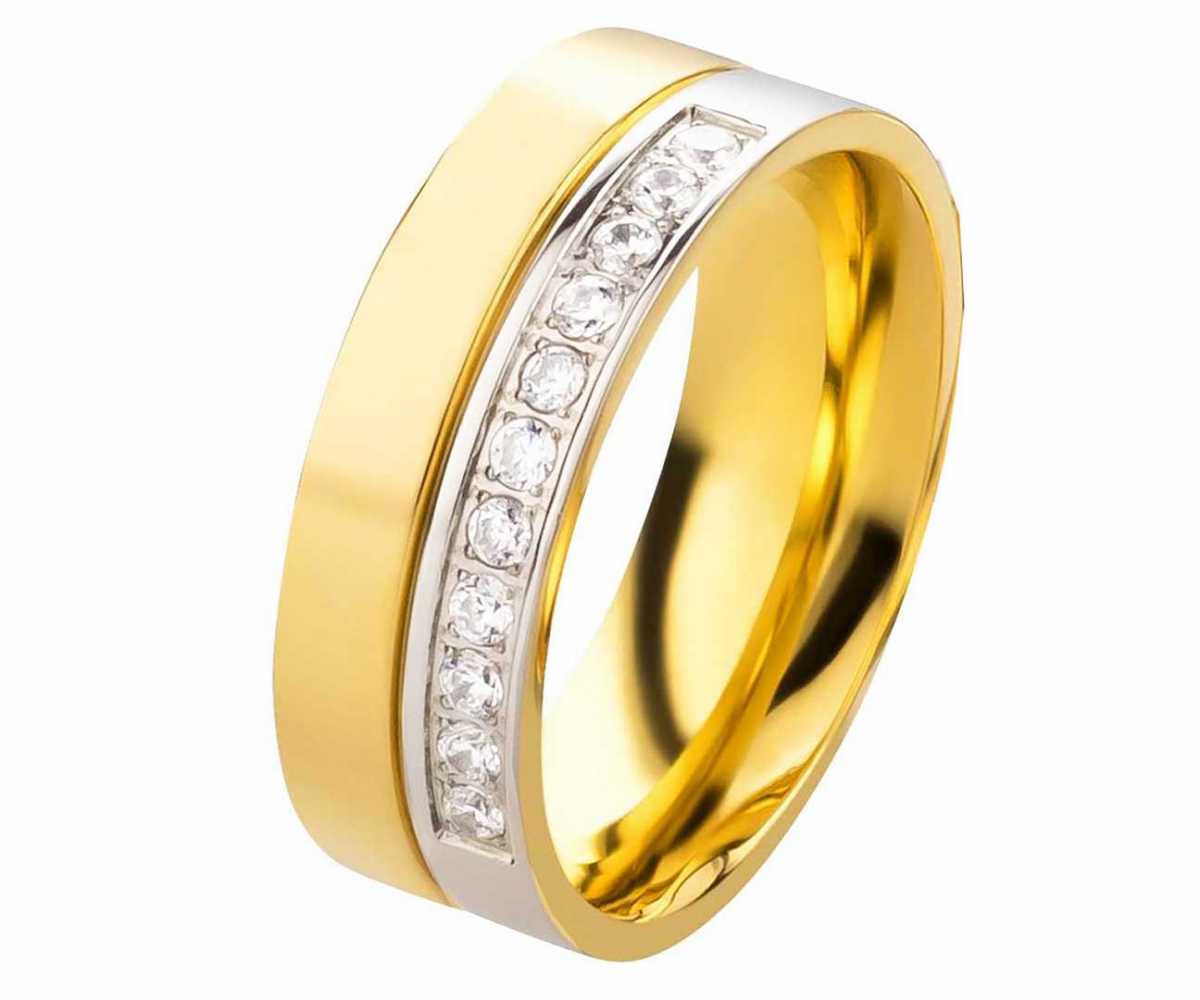 Ringmodell: DE145 Marke: Rings-and-More Ringmaterial: Edelstahl Beschichtet: goldfarbig Ringmaterial massiv: JA Ringbreite Dame: ca. 7,0 mm Steinbesatz im Damenring: Zirkonia Steinform: rund Steinanzahl: 11 Steingroesse: ca.2mm Oberflaeche: Poliert Oberflaeche innen: Poliert Innen: bombiert (abgerundet) Damenringgroessen: 47 bis 62mm (nur in 2er Schritten verfuegbar) Lieferumfang: 1x Damenring und gratis Etui Â