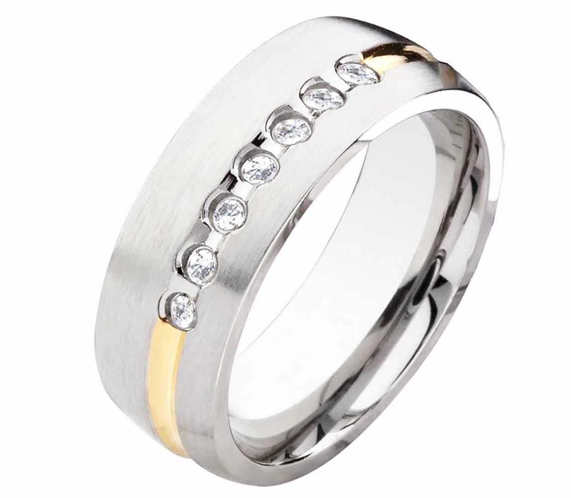 Ringmodell: DE146 Marke: Rings-and-More Ringmaterial: Edelstahl Beschichtet: goldfarbig Ringmaterial massiv: JA Ringbreite Dame: ca. 7,0 mm Steinbesatz im Damenring: Zirkonia Steinform: rund Steinanzahl: 7 Steingroesse: ca.2mm Oberflaeche: Gebuerstet Oberflaeche innen: Poliert Innen: bombiert (abgerundet) Damenringgroessen: 50 bis 58mm (nur in 2er Schritten verfuegbar) Lieferumfang: 1x Damenring und gratis Etui Â