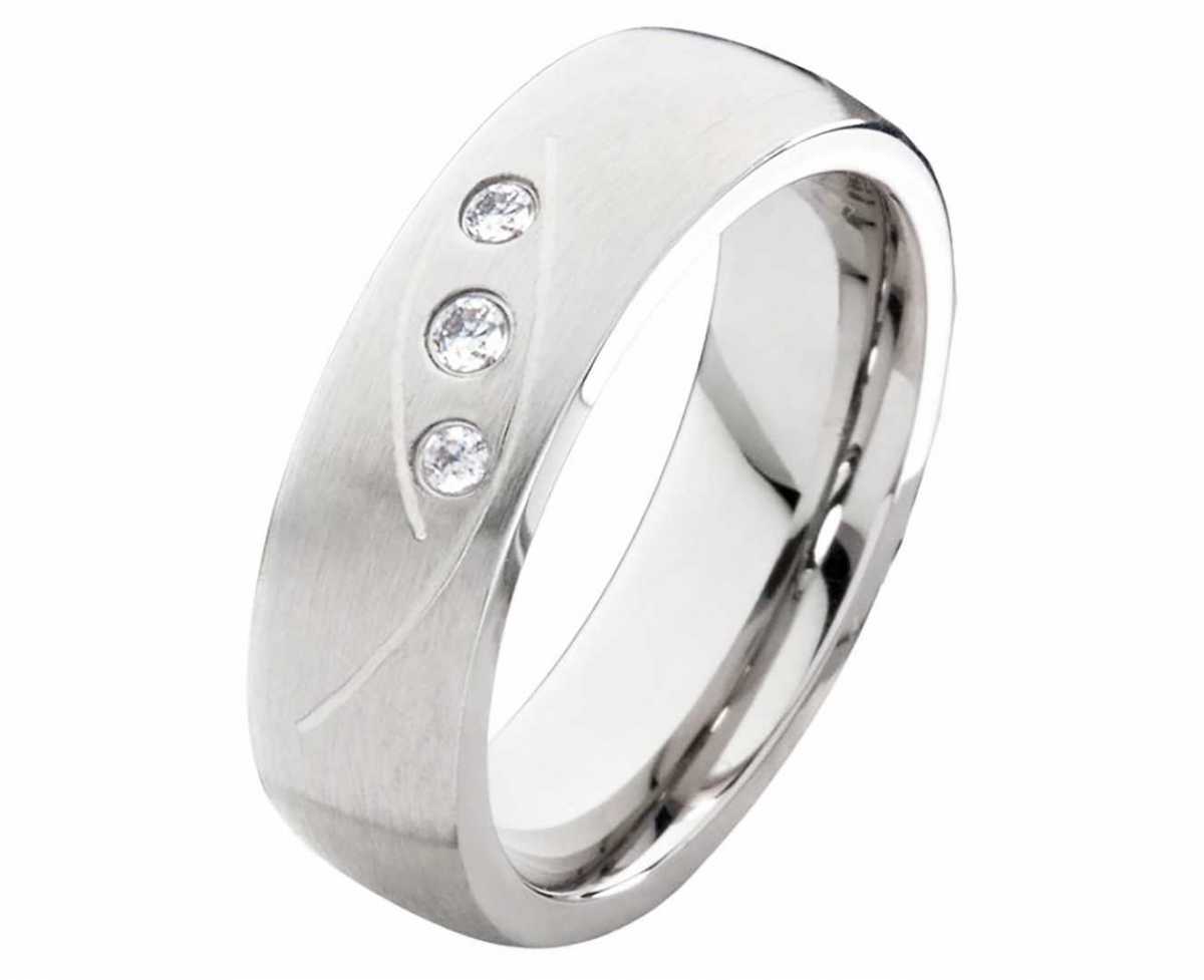 Ringmodell: DE147 Marke: Rings-and-More Ringmaterial: Edelstahl Ringmaterial massiv: JA Ringbreite Dame: ca. 6,0 mm Steinbesatz im Damenring: Zirkonia Steinform: rund Steinanzahl: Steingroesse: ca.2mm 3 Stueck Oberflaeche: Gebuerstet Oberflaeche innen: Poliert Innen: bombiert (abgerundet) Damenringgroessen: 50 bis 58mm (nur in 2er Schritten verfuegbar) Lieferumfang: 1x Damenring und gratis Etui Â