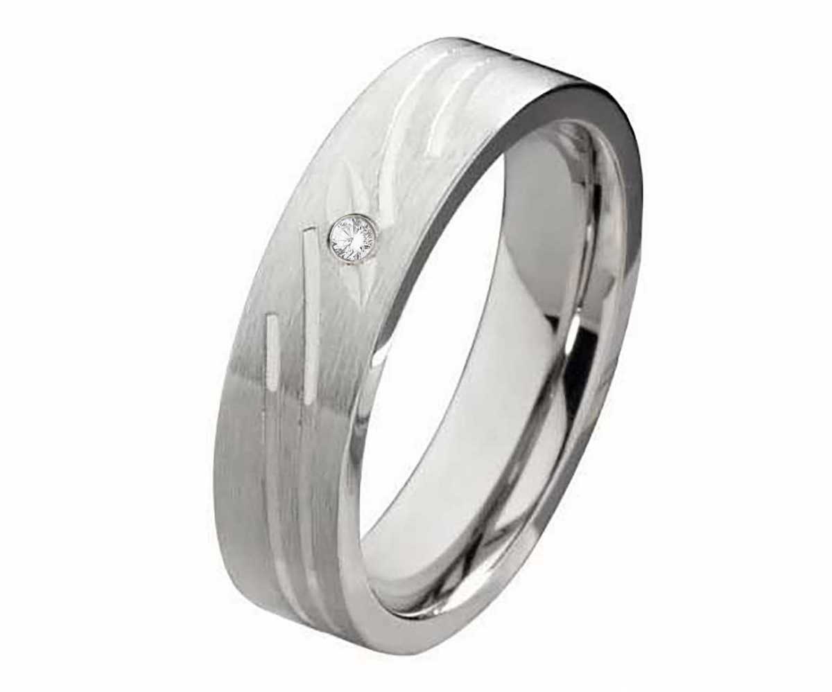Ringmodell: DE149 Marke: Rings-and-More Ringmaterial: Edelstahl Ringmaterial massiv: JA Ringbreite Dame: ca. 6,0 mm Steinbesatz im Damenring: Zirkonia Steinform: rund Steinanzahl: 1 Steingroesse: ca.2mm Oberflaeche: Gebuerstet mit glanzrillen Oberflaeche innen: Poliert Innen: bombiert (abgerundet) Damenringgroessen: 50 bis 58mm (nur in 2er Schritten verfuegbar) Lieferumfang: 1x Damenring und gratis Etui Â