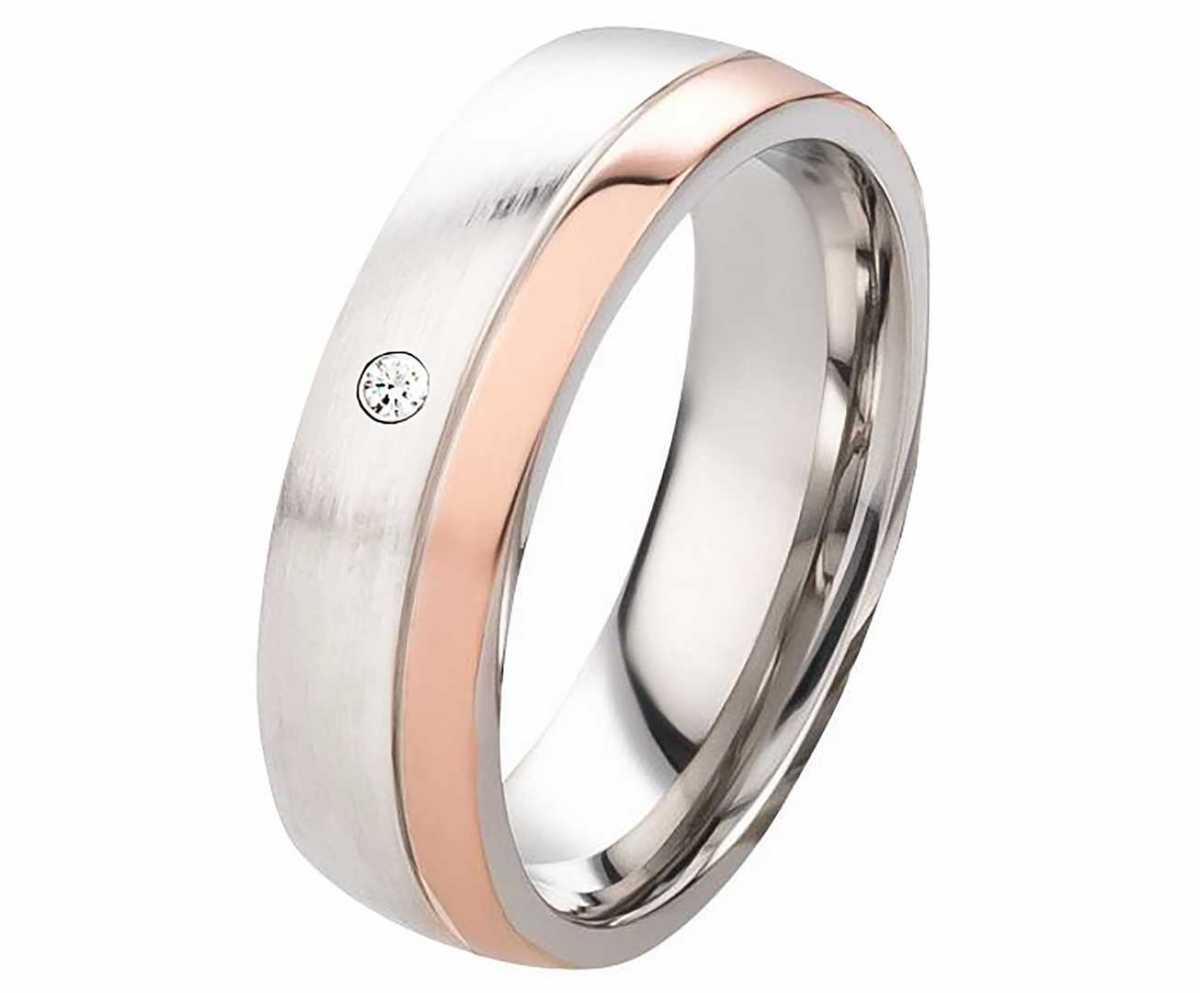 Ringmodell: DE154 Marke: Rings-and-More Ringmaterial: Edelstahl Beschichtet: rosé Ringmaterial massiv: JA Ringbreite Dame: ca. 6,0 mm Steinbesatz im Damenring: Zirkonia Steinform: rund Steinanzahl: 1 Steingroesse: ca.2mm Oberflaeche: Gebuerstetier Oberflaeche innen: Poliert Innen: bombiert (abgerundet) Damenringgroessen: 50 bis 68mm (nur in 2er Schritten verfuegbar) Lieferumfang: 1x Damenring und gratis Etui Â