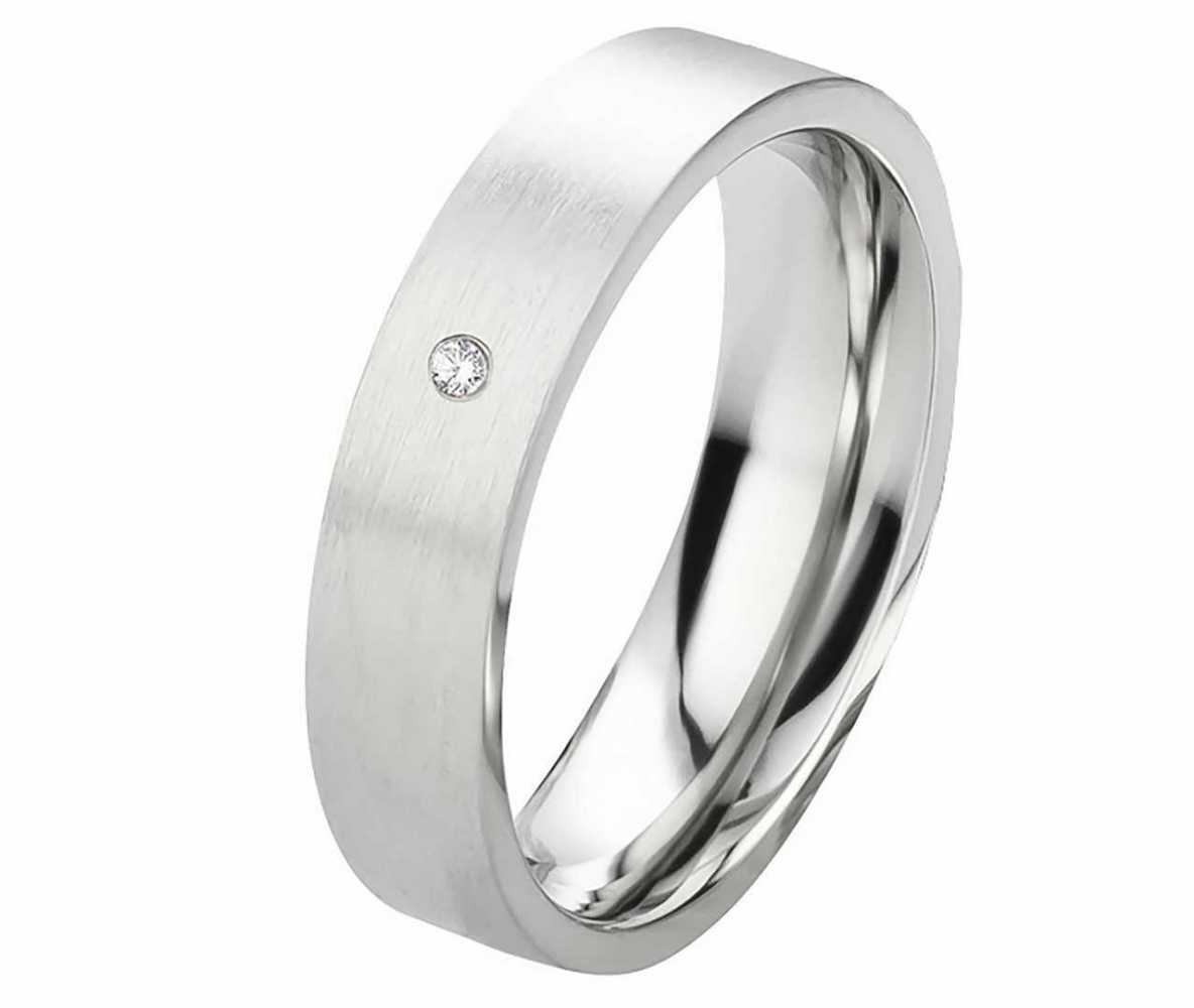 Ringmodell: DE157 Marke: Rings-and-More Ringmaterial: Edelstahl Ringmaterial massiv: JA Ringbreite Dame: ca. 6,0 mm Steinbesatz im Damenring: Diamant Steingroesse: 1,5mm W/SI Oberflaeche: Gebuerstet Oberflaeche innen: Poliert Innen: bombiert (abgerundet) Damenringgroessen: 47 bis 72mm (nur in 2er Schritten verfuegbar) Lieferumfang: 1x Damenring und gratis Etui Â