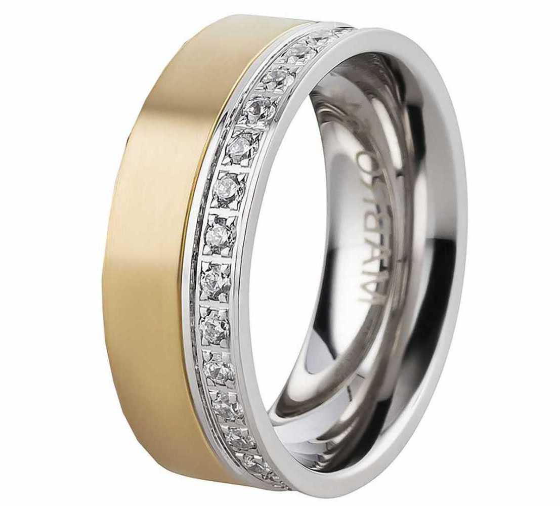 Damenring zweifarbig und Steine rundum Edelstahl AB2842 Ringmodell: AB2842 Marke: Mabro Ringmaterial: Edelstahl Beschichtet: goldfarbig Ringmaterial massiv: JA Ringbreite Dame: ca. 7,0 mm Steinbesatz im Damenring: Zirkonia Steinform: rund Steinanzahl: 28 Steingroesse: ca. 1,5mm Oberflaeche: Gebuerstet Oberflaeche innen: Poliert Innen: bombiert (abgerundet) Damenringgroessen: 50 bis 62mm (nur in 2er Schritten verfuegbar) Lieferumfang: 1x Damenring und gratis Etui Â