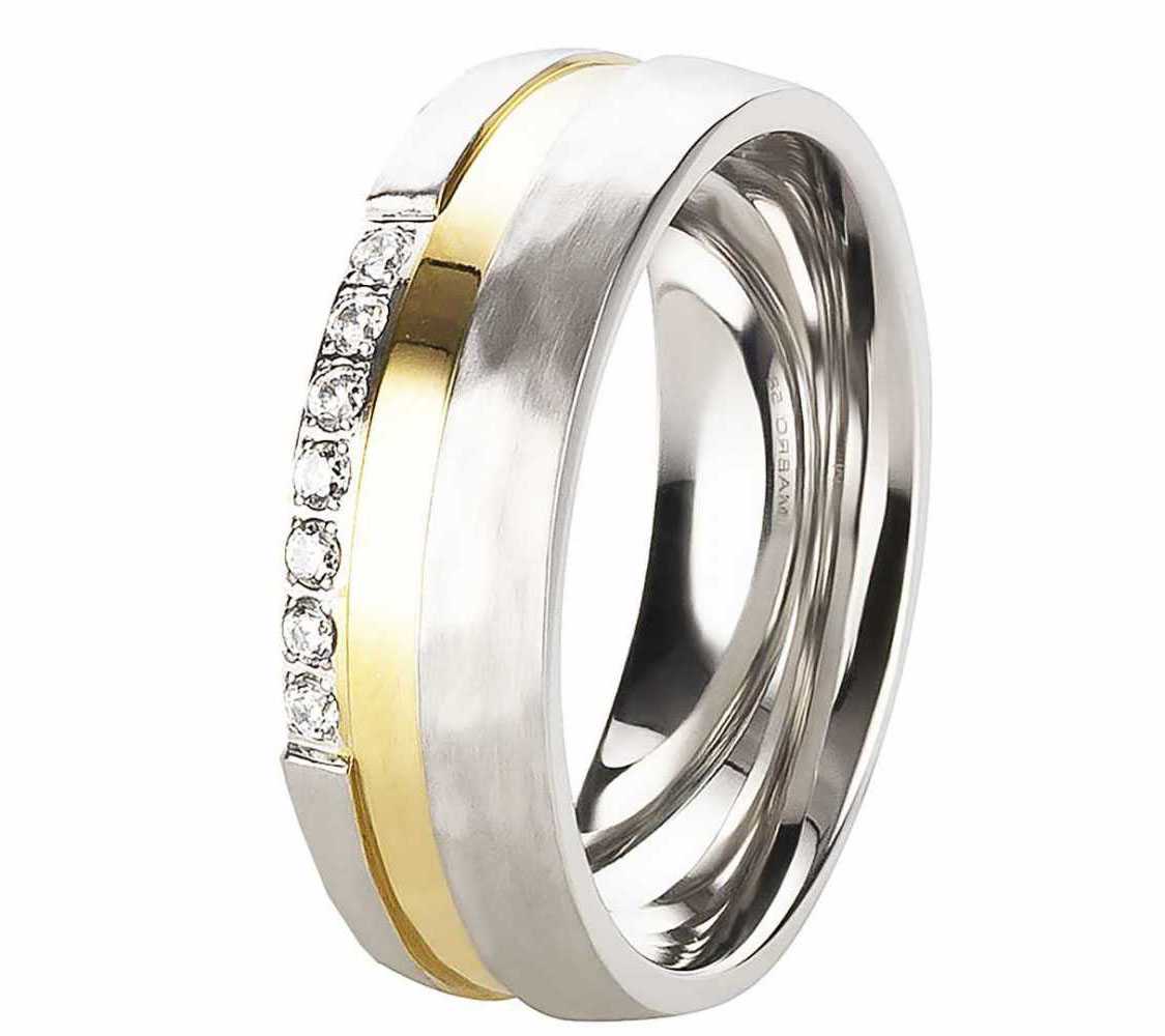 Damenring zweifarbig mit 7 Steine Edelstahl AB3212 Ringmodell: AB3212 Marke: Mabro Ringmaterial: Edelstahl Beschichtet: goldfarbig Ringmaterial massiv: JA Ringbreite Dame: ca. 7,0 mm Steinbesatz im Damenring: Zirkonia Steinform: rund Steinanzahl: 7 Steingroesse: ca. 1,5mm Oberflaeche: Gebuerstet Oberflaeche innen: Poliert Innen: bombiert (abgerundet) Damenringgroessen: 50 bis 62mm (nur in 2er Schritten verfuegbar) Lieferumfang: 1x Damenring und gratis Etui Â