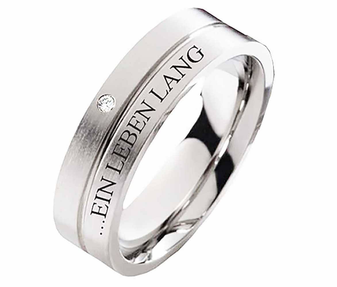Ringmodell: DE291 Marke: Rings-and-More Ringmaterial: Edelstahl Ringmaterial massiv: JA Ringbreite Dame: ca. 6,0 mm Steinbesatz im Damenring: Zirkonia Steinform: rund Steinanzahl: 1 Steingroesse:ca.1.5mm Oberflaeche: Gebuerstet Oberflaeche innen: Poliert Innen: bombiert (abgerundet) Damenringgroessen: 50 bis 72mm (nur in 2er Schritten verfuegbar) Lieferumfang: 1x Damenring und gratis Etui