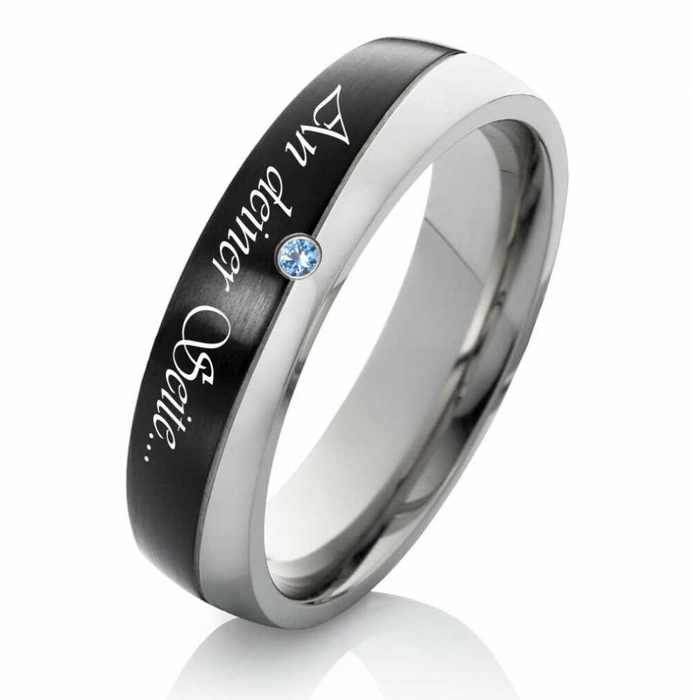 Ringmodell: DE311 Marke: Rings-and-More Ringmaterial: Edelstahl Ringmaterial massiv: JA Ringbreite Dame: ca. 6mm Beschichtung: PVD schwarz Steinbesatz im Damenring: Topas Steinform: rund Steinanzahl: 1 Steingroesse: 1,5mm Oberflaeche: Gebuerstet und Poliert Oberflaeche innen: Poliert Innen: bombiert (abgerundet) Damenringgroessen: 50 bis 68mm (nur in 2er Schritten verfuegbar) Lieferumfang: 1x Damenring und gratis Etui Â