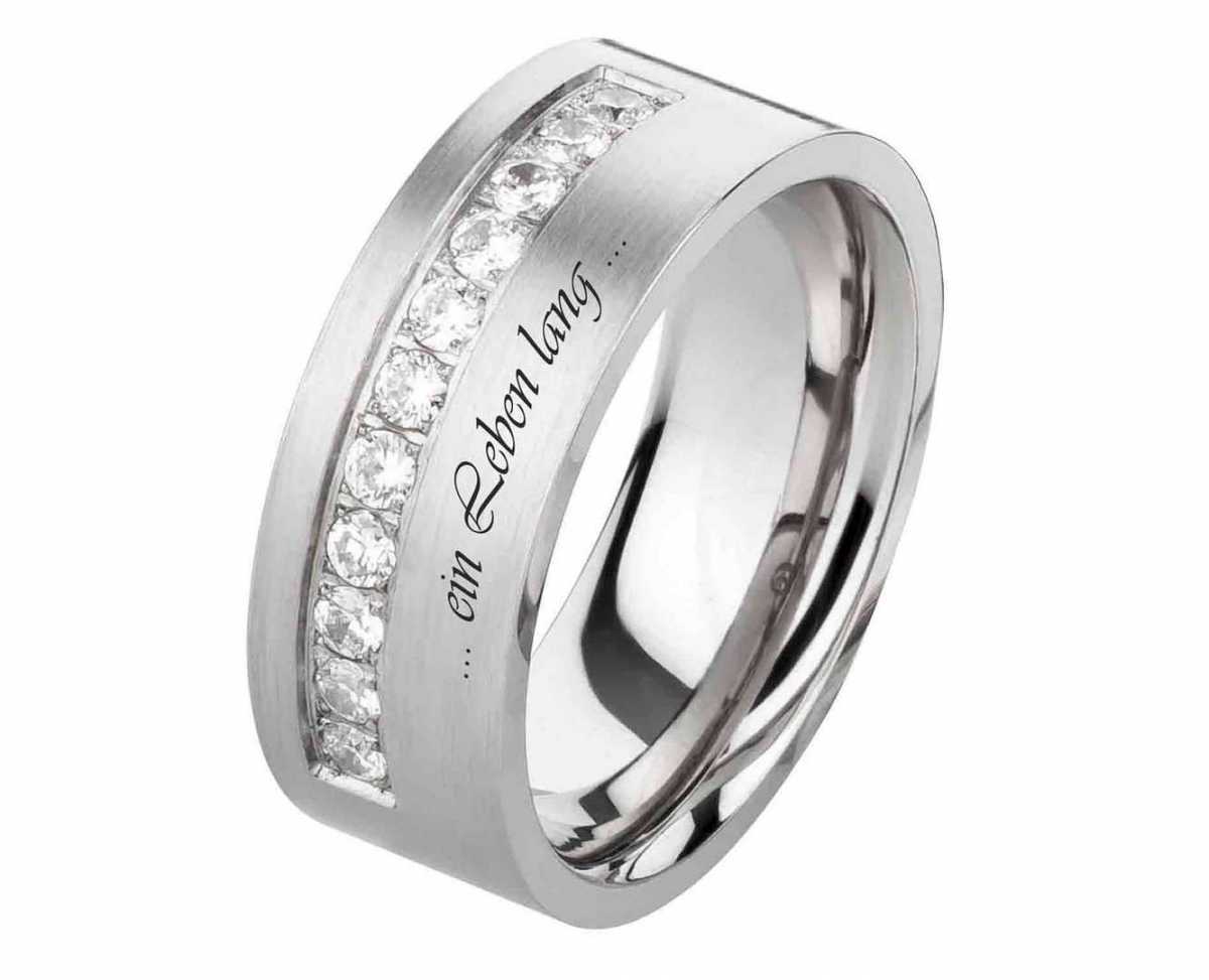Ringmodell: DE313 Marke: Rings-and-More Ringmaterial: Edelstahl Ringmaterial massiv: JA Ringbreite Dame: ca. 8,0 mm Steinbesatz im Damenring: Zirkonia Steinform: rund Steinanzahl: 10 Steingroesse: ca.1,25mm Oberflaeche: Gebuerstet Oberflaeche innen: Poliert Innen: bombiert (abgerundet) Damenringgroessen: 47 bis 58mm (nur in 2er Schritten verfuegbar) Lieferumfang: 1x Damenring und gratis Etui Â