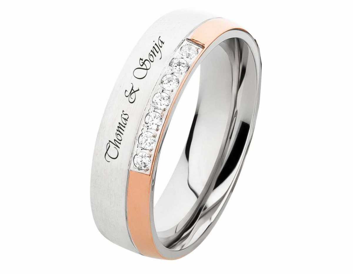 Schoener Damen Ring aus Edelstahl mit Gravur Ringmodell: DE338 Marke: Rings-and-More Ringmaterial: Edelstahl Beschichtet: rosè Ringmaterial massiv: JA Ringbreite Dame: ca. 6,0 mm Steinbesatz im Damenring: Zirkonia Steinform: rund Steinanzahl: 7 Steingroesse: ca.1,5mm Oberflaeche: Gebuerstet Oberflaeche innen: Poliert Innen: bombiert (abgerundet) Damenringgroessen: 50 bis 62mm (nur in 2er Schritten verfuegbar) Lieferumfang: 1x Damenring und gratis Etui