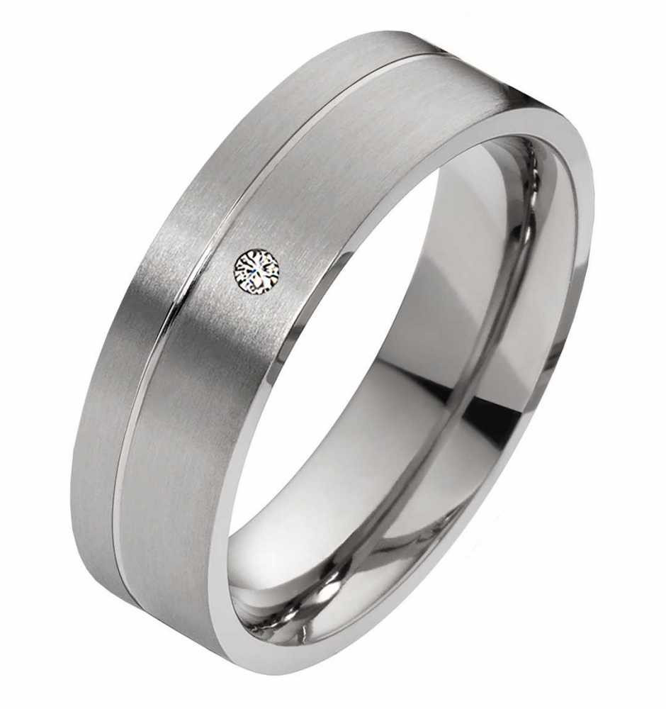 Moderner Damen Ring mit Gravur aus Titan Dieser massiven Damenring ist auf der Oberflaeche aussen  mattiert. Der Damenring ist 6mm oder 8mm breit. Der Blickfang dieses Damenrings  ist der 2,5mm grosse eingefasste Zirkonia. Die Lasergravur kann auf der polierten Innenseite angebracht und je nach Wunsch ganz individuell formuliert werden. Verschiedene Schriftarten stehen zur Verfuegung und die Botschaft kann eine Laenge von 30 Zeichen haben. Dieser Ring aus dem Hause Rings-and-More wird in einem schwarzen gratis Etui ausgeliefert. Kosten fuer den deutschlandweiten Versand kommen keine dazu. Ringmodell: DT018 Marke: Rings-and-More Ringmaterial: Titan Ringmaterial: massiv Ringbreite Dame: ca. 6mm oder 8mm Steinbesatz im Damenring : Zirkonia oder Diamant Steingroesse: ca.2mm oder 0,01WSI Oberflaeche: mattiert Oberflaeche innen: bombiert (abgerundet) Innen: poliert Damenringgroessen: 50 bis 72mm (nur in 2er Schritten verfuegbar) Lieferumfang : 1x Damenring und gratis Etui