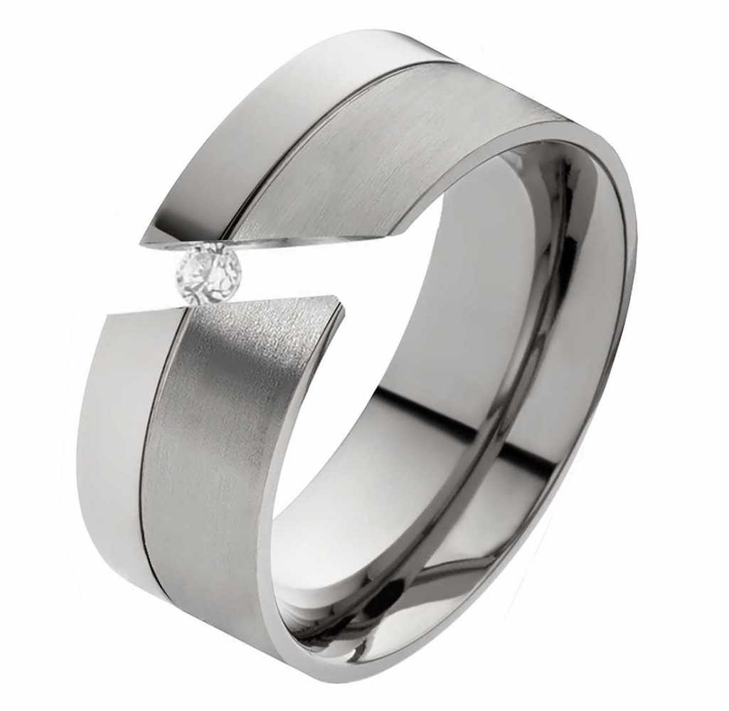 Moderner Damenring aus Titan mit einem eingespannten Zirkonia Dieser wunderschoene Einzelring aus Titan hat eine sehr moderne Optik und ist auf der Oberflaeche aussen mattiert und poliert. Die Breite des Ringes betraegt 8,0mm. Auffaellig ist der Damenring, in dem ein runder, 2,5mm grosser Zirkonia eingespannt ist. Auf der polierten Innenflaeche haben ganz wunderbar Worte der Liebe oder Freundschaft Platz. Diese Lasergravur ist gratis und kann individuell mittels sieben Schriftarten formuliert werden. Die Laenge darf 30 Zeichen nicht ueberschreiten. Dieser Freundschafts- oder Verlobungsring ist innen bombiert, damit er angenehm zu tragen ist. Zusaetzlich wird dieses edle Schmuckstueck in einem schwarzen gratis Etui verschickt. Im Angebot enthalten sind die Kosten fuer den Versand innerhalb von ganz Deutschland. Ringmodell: DT054 Marke: Rings-and-More Ringmaterial: Titan Ringmaterial: massiv Ringbreite Dame: ca. 8mm Steinbesatz im Damenring : Zirkonia Steingroesse: ca.2,5mm Oberflaeche: mattiert und poliert Oberflaeche innen: bombiert (abgerundet) Innen: poliert Damenringgroessen:Â 47 bis 72mm (nur in 2er Schritten verfuegbar) Lieferumfang : 1x Damenring und gratis Etui