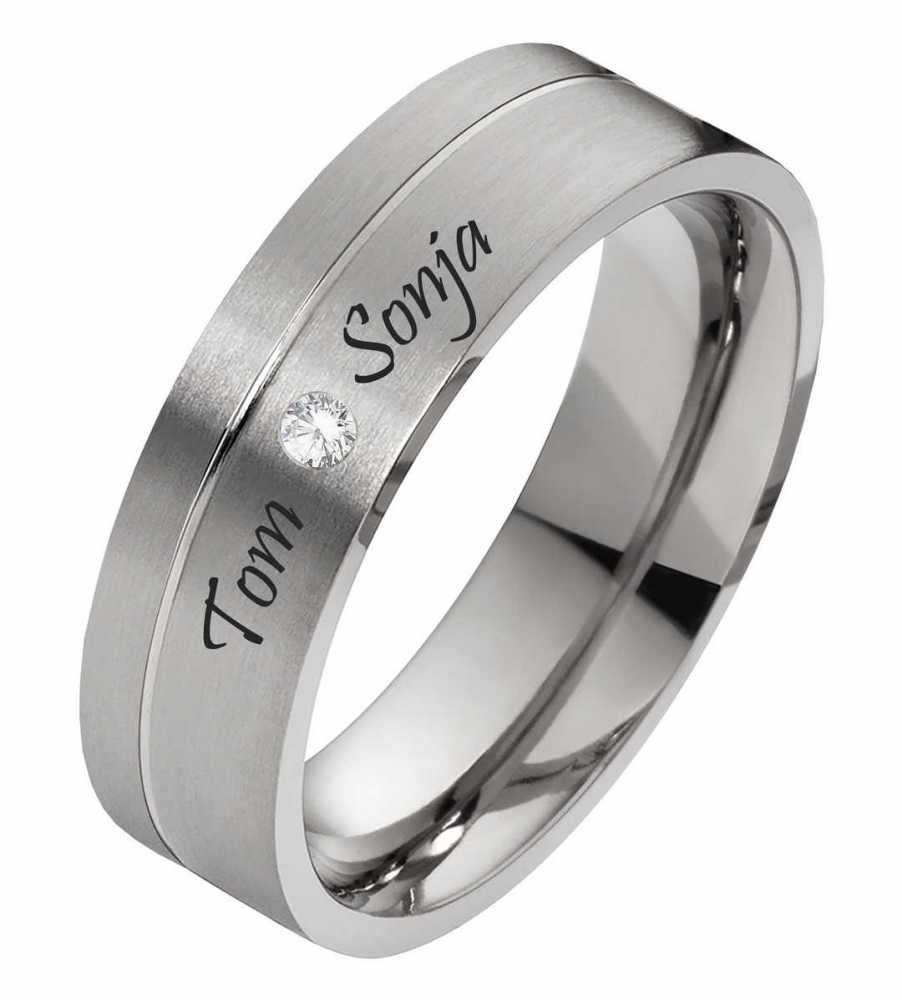 Hinreissend schoener Titanring mit Glanzrille, Gravur und Zirkonia Dieser hinreissend schoene Einzelring aus dem Hause Rings-and-More ist auf der mattierten Oberflaeche zusaetzlich mit einer Glanzrille veredelt. Der Ring ist 6,0 mm breit und auf der Innenseite poliert und so abgerundet, dass der Tragekomfort sehr hochwertig ist. Der Damenring sticht einem sofort durch den 2,0 mm grossen weissen runden Zirkonia ins Auge. Um diesen Freundschafts- oder Verlobungsring zu etwas ganz besonderem zu machen, kann auf der Oberflaeche aussen eine gratis Gravur angebracht werden. Dadurch kann man seine Verbundenheit eindrucksvoll zur Geltung bringen. Es stehen sieben Schriftarten zur Auswahl. Diese Botschaft der Liebe darf bis zu 30 Zeichen lang sein. Damit man diesen wunderschoenen Ring gut aufbewahren kann, wird ein gratis Etui mitgeschickt. Fuer den Versand innerhalb von Deutschland fallen keine weiteren Kosten an. Ringmodell: DT073 Marke: Rings-and-More Ringmaterial: Titan Ringmaterial: massiv Ringbreite Dame: ca. 6mm Steinbesatz im Damenring : Zirkonia Steingroesse: ca.2mm Oberflaeche: mattiert Oberflaeche innen: bombiert (abgerundet) Innen: poliert Damenringgroessen: 50 bis 72mm (nur in 2er Schritten verfuegbar) Lieferumfang : 1x Damenring und gratis Etui