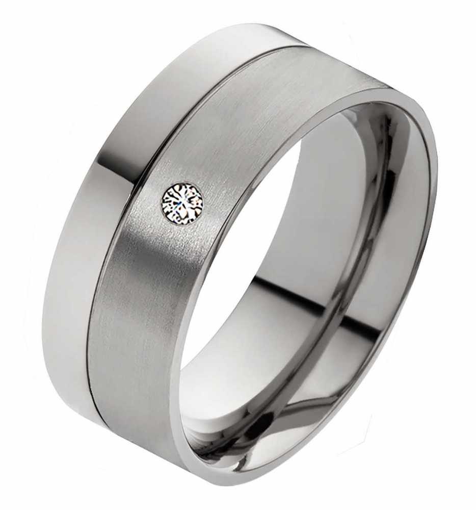 Markanter Damenring mit einem zauberhaften Zirkonia Wer etwas breitere Ringe bevorzugt, liegt mit diesem Einzelring aus Titan genau richtig. Dieser Ring ist 8,0 mm breit und auf der polierten Innenflaeche extra abgerundet, damit ein hochwertiger Tragekomfort garantiert ist. Man kann ihn als Verlobungs-, Freundschafts- oder auch als Trauring tragen. Die Oberflaeche aussen ist mattiert, poliert und durch eine Glanzrille zusaetzlich veredelt. Ein weiters Highlight ist der 2,5 mm grosse weisse Zirkonia auf dem Damenring. Die gratis Gravur, die mittels eines Lasers angebracht wird, findet auf der Innenseite ihren Platz. Diese versteckte Botschaft kann man ganz individuell formulieren. Es stehen sieben Schriftarten zur Auswahl und die Gravur kann bis zu 30 Zeichen lang sein. Die gratis Box, die extra mitgeliefert wird, kann man auch sehr gut als Geschenkbox verwenden. Die Versandkosten innerhalb von Deutschland sind selbstverstaendlich inklusive. Ringmodell: DT082 Marke: Rings-and-More Ringmaterial: Titan Ringmaterial: massiv Ringbreite Dame: ca. 8mm Steinbesatz im Damenring : Zirkonia Steingroesse: ca.2,5mm Oberflaeche: mattiert und poliert Oberflaeche innen: bombiert (abgerundet) Innen: poliert Damenringgroessen: 47 bis 72mm (nur in 2er Schritten verfuegbar) Lieferumfang : 1x Damenring und gratis Etui