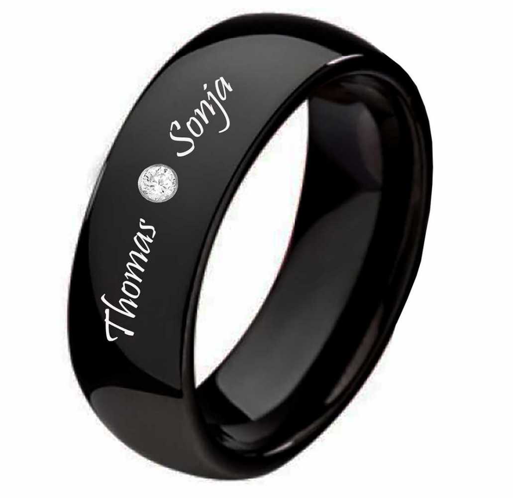 Umwerfend schoener Damenring aus Wolfram mit Aussengravur und Zirkonia Auf der Aussenflaeche dieses Wolframringes fuer die Dame findet eine kostenfreie Lasergravur ihren Platz. Diese Nachricht kann ganz speziell auf die Traegerin abgestimmt werden. Sie kann bis zu 30 Zeichen lang sein und man kann zwischen sieben Schriftarten waehlen. Dieser massive, polierte und schwarz beschichtete Ring auf der Aussen- und Innenseite wird noch zusaetzlich durch einen runden 2,0 mm grossen Zirkonia veredelt. Die Breite des Ringes betraegt 7,0 mm. Das angenehme Tragegefuehl ist durch die abgerundete Innenflaeche garantiert. Die mitgelieferte schwarze Box ist gibt es gratis zu der Bestellung dazu. Innerhalb von ganz Deutschland fallen keine zusaetzlichen Kosten fuer das Porto an. Ringmodell: DW109 Marke: Rings-and-More Ringmaterial: Wolfram Beschichtung: schwarz Ringmaterial: massiv Ringbreite Dame: ca. 7,0 mm Steinbesatz: Zirkonia Steingroesse: ca. 2mm Oberflaeche: poliert Innen: bombiert ( abgerundet) Oberflaeche Innen: poliert Damenringgroessen: 47 bis 70mm (nur in 2er Schritten verfuegbar) Lieferumfang : 1x Damenring und gratis Etui