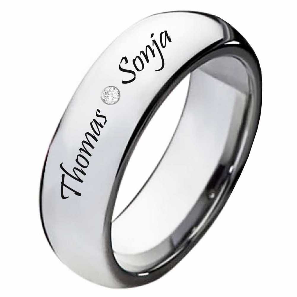 Schlichter Damenring aus Wolfram mit Zirkonia Diesen massiven Wolframring fuer die Dame schmueckt ein runder 2,0 mm grosser Zirkonia. Die Oberflaeche aussen poliert und gratis gravierbar. Der Damenring hat eine Breite von 6,0 mm. Die kostenfreie Gravur wird mit einem Laser angebracht und kann bis zu 30 Zeichen lang sein. Fuer die persoenliche Note hat man sieben Schriftarten zu Wahl. Die polierte Innenseite ist extra abgerundet, sodass das Tragegefuehl sehr angenehm ist. Versandkosten innerhalb von Deutschland fallen keine an. Der Ring wird in einem edlen gratis Etui in Schwarz zugeschickt. Ringmodell: DW128 Marke: Rings-and-More Ringmaterial: Wolfram Ringmaterial: massiv Ringbreite Dame: ca. 6,0 mm Steinbesatz im Damenring : Zirkonia Steinform: rund Steinanzahl: 1 Steingroesse: ca.2mm Oberflaeche: poliert Innen: bombiert ( abgerundet) Oberflaeche Innen: poliert Damenringgroessen: 47 bis 72mm (nur in 2er Schritten verfuegbar) Lieferumfang : 1x Damenring und gratis Etui