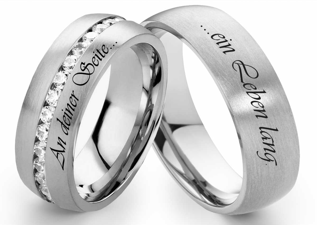 Stilvolle Edelstahlringe mit umlaufenden Zirkonias Stilvolle Ringe aus Edelstahl. Die sehr hochwertig verarbeiteten Ringe aus dem Hause Rings-and-More sind 7 und 8mm breit. Der Mattierte Damenring ist rundherum mit Zirkonia Steinen besetzt. Die Gravur kann innen und aussen nach Ihren Wuenschen gefertigt werden. Die Ringe sind innen abgerundet und sehr angenehm zu tragen. Es wird auch ein Etui mitgesendet. Diese Ringe koennen als Partnerringe, Verlobungsringe, Freundschaftsringe oder auch als Eheringe getragen werden. Ringmodell: E137 Marke: Rings-and-More Ringmaterial: Edelstahl Ringmaterial massiv: JA Ringbreite Dame: ca. 8mm Ringbreite Herr: ca. 8mm Steinbesatz im Damenring: Zirkonia Steinform: rund Steinanzahl: umlaufend Steingroesse: ca.1,5mm Oberflaeche: Mattiert Oberflaeche innen: Poliert Innen: bombiert (abgerundet) Damenringgroessen: 50 bis 60mm (nur in 2er Schritten verfuegbar) Herrenringgroessen: 50 bis 72mm (nur in 2er Schritten verfuegbar) Lieferumfang: 1x Paar (1x Damenring und 1 x Herrenring) und Etui