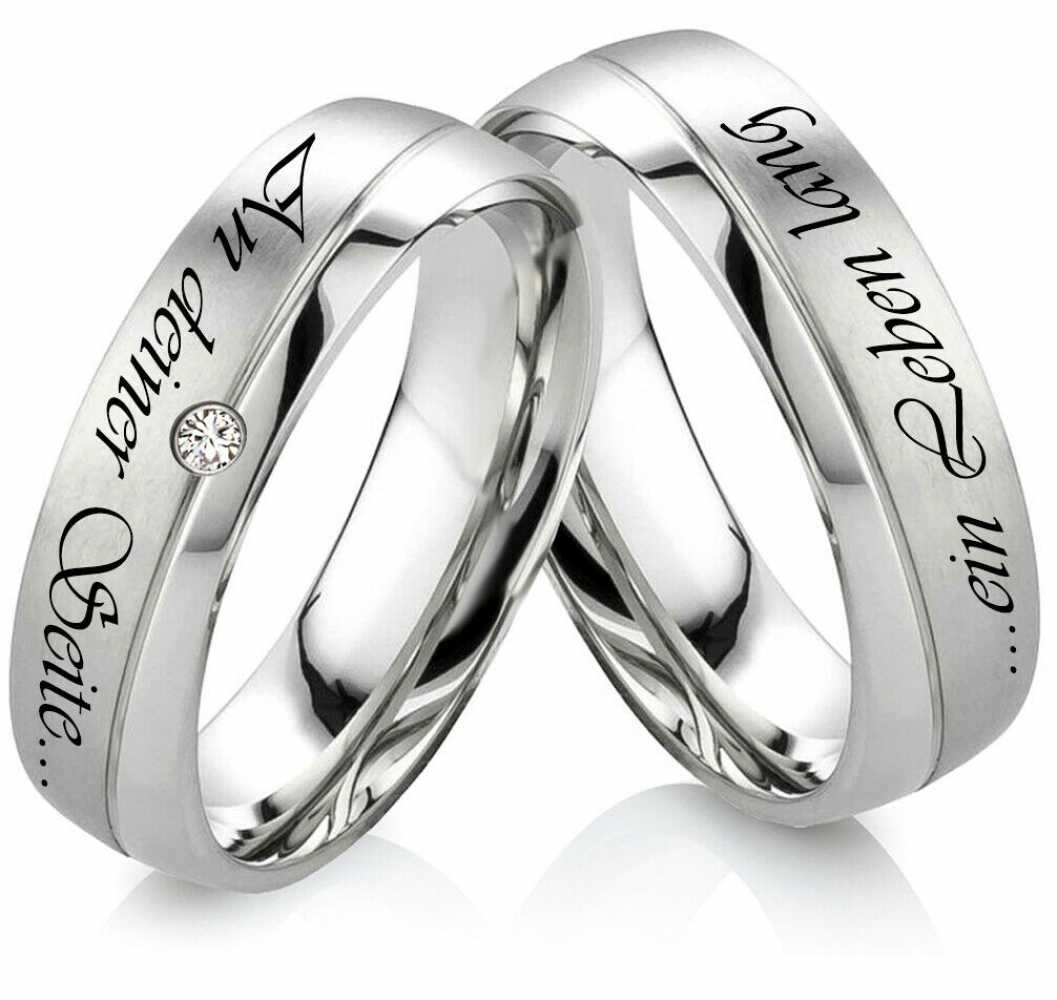 Edle Ringe aus Edelstahl mit Glanzrille und Stein Diese Ringe aus Edelstahl kann man sowohl als Freundschafts- oder als Eheringe tragen. Sie sind beide 6mm breit und auf der Mattierten und Polierten Aussenflaeche durch eine Glanzrille geschmueckt. Der Ring fuer die Dame hat einen runden Zirkonia oder einen Diamant eingefasst, der ca. 1,5mm gross ist. Auf der bombierten und Polierten Innenseite findet eine Gravur noch ihren Platz. Diese kann ganz individuell nach den Wuenschen der Traegerin und des Traegers anhand von sieben Schriftarten formuliert werden. Dadurch werden diese Ringe etwas fuer die Ewigkeit. Der Herrenring ist ohne Stein. Traegt man dieses edle Ring-Set einmal nicht, so kann man die Ringe wunderbar in dem eigenes dafuer mitgelieferten Etui aufbewahren. Die Versandkosten innerhalb von Deutschland sind im Preis natuerlich enthalten. Ringmodell: H0135 Marke: Rings-and-More Ringmaterial: Edelstahl Ringmaterial massiv: JA Ringbreite Dame: ca. 6mm Ringbreite Herr: ca. 6mm Steinbesatz im Damenring: Zirkonia oder Diamant Steinform: rund Steinanzahl: 1 Steingroesse: ca.1,5mm oder 0,02ct W/si Oberflaeche: Gebuerstet und Poliert Oberflaeche innen: Poliert Innen: bombiert (abgerundet) Damenringgroessen: 50 bis 72mm (nur in 2er Schritten verfuegbar) Herrenringgroessen: 50 bis 72mm (nur in 2er Schritten verfuegbar) Lieferumfang: 1x Paar (1x Damenring und 1 x Herrenring) und Etui