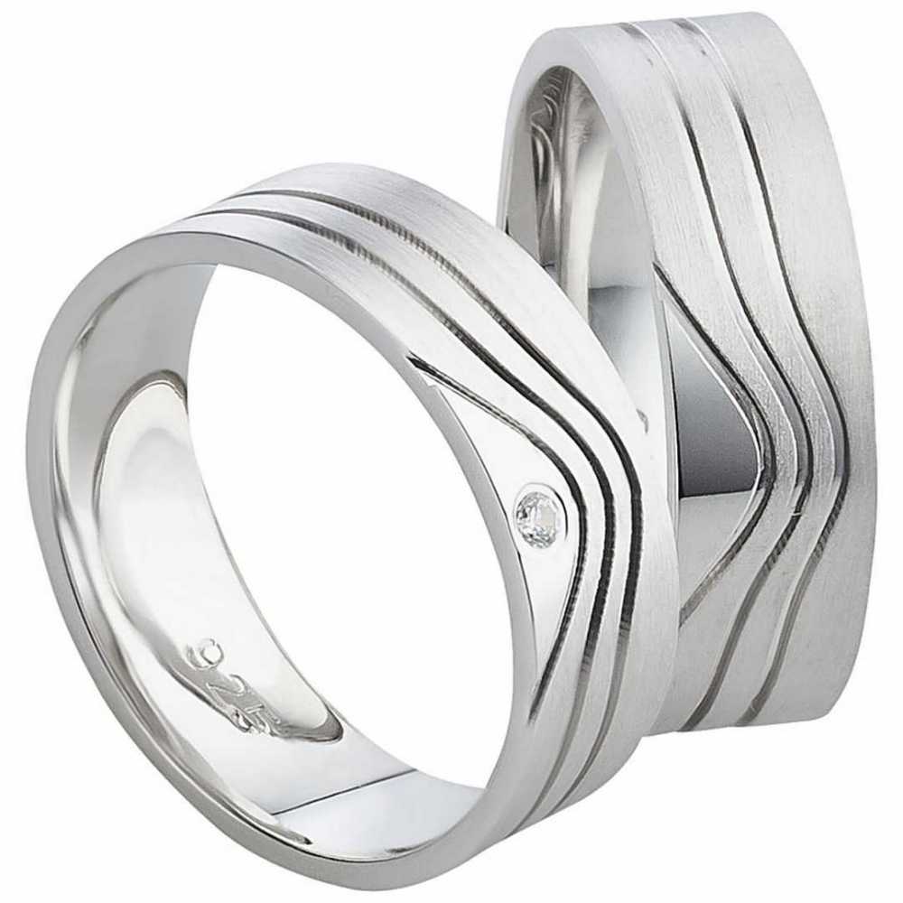 Edle Silberringe mit geschwungenen Glanzrille Mit gleich drei Glanzrille auf der Oberflaeche sind diese Partnerringe aus 925er Silber geschmueckt. Durch diese Optik fallen diese Ringe sofort auf. Die mattierte Oberflaeche hat auf dem Damenring zusaetzlich noch einen weissen Zirkonia mit der Groesse 2,5mm. Beide Ringe, die man als Freundschaftsringe oder auch Eheringe tragen kann, sind 6,3 mm breit und auf der Innenseite poliert. Die gratis Gravur, die auf diesen Silberringen auf der Innenflaeche vorgesehen ist, kann mittels sieben Schriftarten formuliert werden. Diese ist ein weiteres Zeichen der Liebe und Verbundenheit. Zur Aufbewahrung wird ein schwarzes gratis Etui mitgeliefert. Die Kosten fuer den Versand sind im Angebot enthalten, wenn die Ringe innerhalb von Deutschland verschickt werden. Partnerringe Silberringe sind mit gratis Gravur und Etui. Ringmodell: SR088-SR089 Marke: Mabro Ringmaterial : Silber 925/-rhodiniert Ringbreite Dame: ca. 6,3 mm Ringbreite Herr: ca. 6,3 mm Steinbesatz im Damenring : 1x Zirkonia Steingroesse: ca.2,5mm Oberflaeche: mattiert und poliert Damenringgroessen: 50 bis 62 Herrenringgroessen: 54 bis 72 Lieferumfang : 1 Paar (1x Damenring und 1 x Herrenring) und gratis Etui