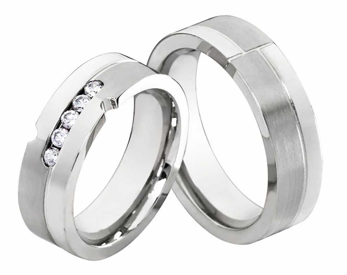 Eindrucksvolle Edelstahlringe mit Gravur und Zirkonias Diese Edelstahlringe haben eine extravagante Optik und stechen dadurch sofort ins Auge. Die Oberflaeche ist Mattiert und Poliert und durch Glanzrille sehr hochwertig verarbeitet. Beide Ringe, die man entweder als Verlobungs- oder auch als Freundschaftsringe tragen kann, sind 6mm breit und auf der Polierten und bombierten Innenflaeche gravierbar. Diese Botschaft kann mittels sieben Schriftarten in Worte gefasst werden und ist im Angebot enthalten. Ebenso wie ein edles schwarzes Etui. Auf dem Ring fuer die Dame funkeln 5 weisse runde Zirkonias mit einer Groesse von jeweilss 2,0 mm. Auf dem Herrenring sind keine Steine. Kosten fuer den Versand innerhalb von Deutschland fallen keine an. Ringmodell: E148 Marke: Rings-and-More Ringmaterial: Edelstahl Ringmaterial massiv: JA Ringbreite Dame: ca. 6mm Ringbreite Herr: ca. 6mm Steinbesatz im Damenring: Zirkonia Steinform: rund Steinanzahl: 5 Steingroesse: ca.2mm Oberflaeche: Mattiert und Poliert Oberflaeche innen: Poliert Innen: bombiert (abgerundet) Damenringgroessen: 50 bis 58mm (nur in 2er Schritten verfuegbar) Herrenringgroessen: 58 bis 66mm (nur in 2er Schritten verfuegbar) Lieferumfang: 1x Paar (1x Damenring und 1 x Herrenring) und Etui