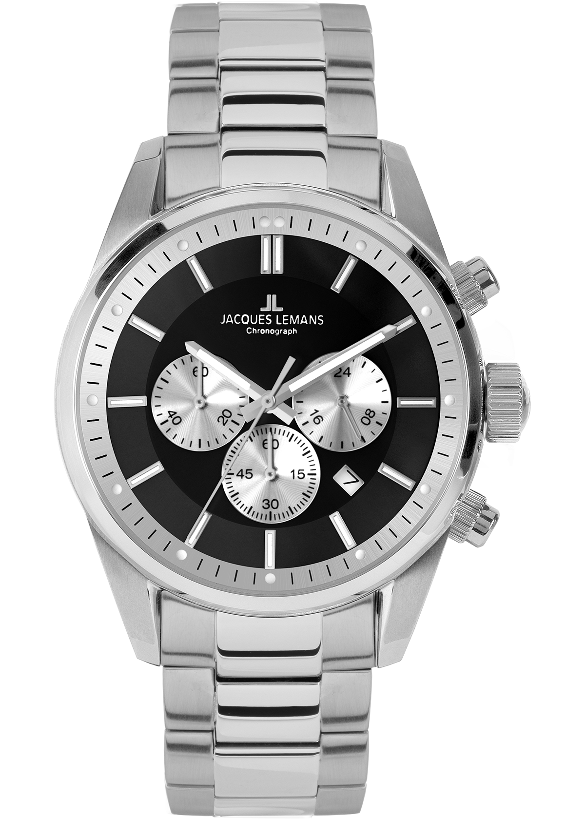 Das Modell 42-6.1E von Jacques Lemans ist ein klassisch, sportlicher Zeitmesser mit einem dezent, eleganten Touch. Das Gehoe¤use aus massiv Edelstahl hat einen Durchmesser von 42mm. Es umrahmt ein schoenes, graues Zifferblatt mit Sonnenschliff und hellen Chronoringen fuer 24-Stunden Anzeige, Minuten- und Sekundenzoe¤hler und zeigt auch ein kleines Datum zwischen vier und fuenf Uhr. Dieses Modell hat ein Quarzwerk, gehoe¤rtetes Crystex Glas, einen runden, verschraubten Gehoe¤useboden und eine Wasserdichtigkeit von bis zu 10ATM. Das Band aus massiv Edelstahl mit SicherheitsfaltschlieoeŸe rundet den edlen Look perfekt ab – dieser Chronograph ist ein markanter Zeitmesser, der seine Wirkung immer behalten wird.