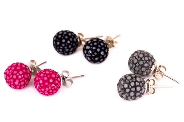Die „Katy“ Ohrringe sind mit Rochenleder ueberzogen und in verschiedenen Farben erhaeltlich. Sie sind ideal fuer einen coolen und laessigen Alltagslook und ueberzeugen durch ihre Schlichtheit. Masse: 8 mm Durchmesser
