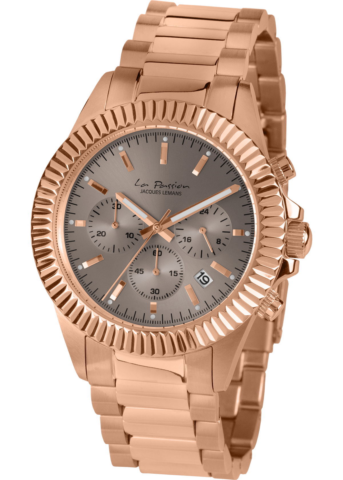 Das Modell LP-111K aus der La Passion Kollektion von Jacques Lemans ist ein wundersch�ner, sportlich eleganter Chronograph. Das braune Zifferblatt mit Sonnenschliff zeigt dezente Indexes, die Chronoringe mit 24-Stundenanzeige, Sekunden- und Minutenz�hler und Datum sind ein edler Blickfang. Das Geh�use aus massiv Edelstahl/IP-ros� mit einem Durchmesser von 42mm betont das eindrucksvolle Design dieser Uhr. Das Modell hat ein Quarzwerk, geh�rtetes Crystex Glas, einen runden, verschraubten Geh�useboden und eine Wasserdichtigkeit bis 10 ATM. Das Metallband aus massiv Edelstahl/IP-ros� mit Faltschlie�e mit Dr�cker und Sicherheitsb�gel rundet die stilvolle Erscheinung gekonnt ab – dieser Zeitmesser ist der perfekte Inbegriff eleganter Sportlichkeit.