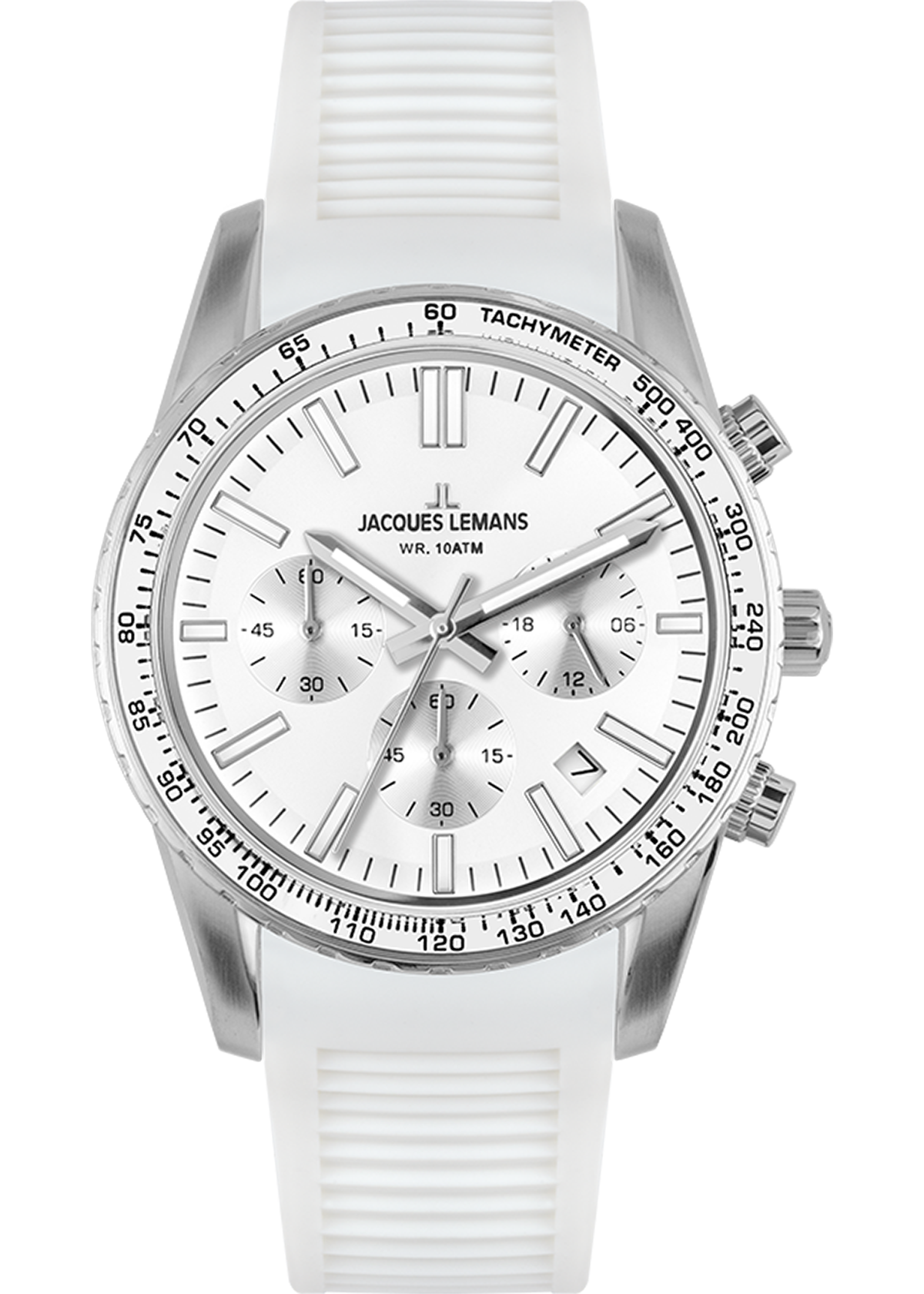 Dieser Chronograph von Jacques Lemans ist ein wirklich trendiger Zeitmesser. Das Gehoe¤use aus massiv Edelstahl hat mit 39mm Durchmesser die perfekte GroeoeŸe. Das weioeŸe Zifferblatt mit hellen Chronoringen und Indexes zeigt eine Datums- und 24-Stundenanzeige, Minuten- und Sekundenzoe¤hler und eine Stoppfunktion. Das Modell hat ein Quarzwerk, einen runden, verschraubten Gehoe¤useboden, gehoe¤rtetes Crystex Glas und ist bis zu 10ATM wasserdicht. Das weioeŸe Silikonband mit DornschlieoeŸe ergoe¤nzt den markanten Look – dieser Zeitmesser ist sowohl zum Anzug, als auch zum sportlichen Outfit das perfekte Accessoire.