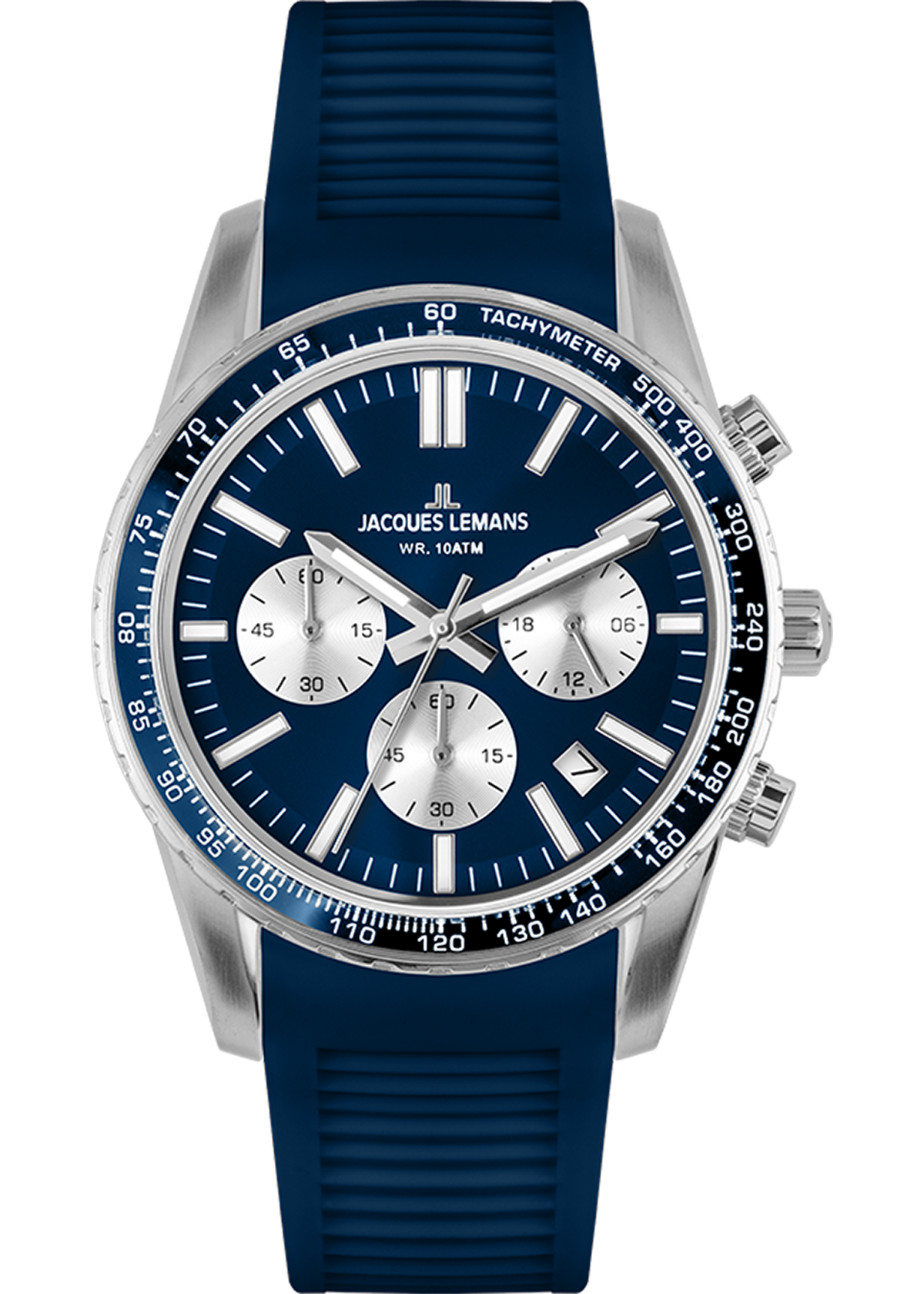 Dieser Chronograph von Jacques Lemans ist ein wirklich trendiger Zeitmesser. Das Gehoe¤use aus massiv Edelstahl hat mit 39mm Durchmesser die perfekte GroeoeŸe. Das dunkelblaue Zifferblatt mit hellen Chronoringen und Indexes zeigt eine Datums- und 24-Stundenanzeige, Minuten- und Sekundenzoe¤hler und eine Stoppfunktion. Das Modell hat ein Quarzwerk, einen runden, verschraubten Gehoe¤useboden, gehoe¤rtetes Crystex Glas und ist bis zu 10ATM wasserdicht. Das dunkelblaue Silikonband mit DornschlieoeŸe ergoe¤nzt den markanten Look – dieser Zeitmesser ist sowohl zum Anzug, als auch zum sportlichen Outfit das perfekte Accessoire.