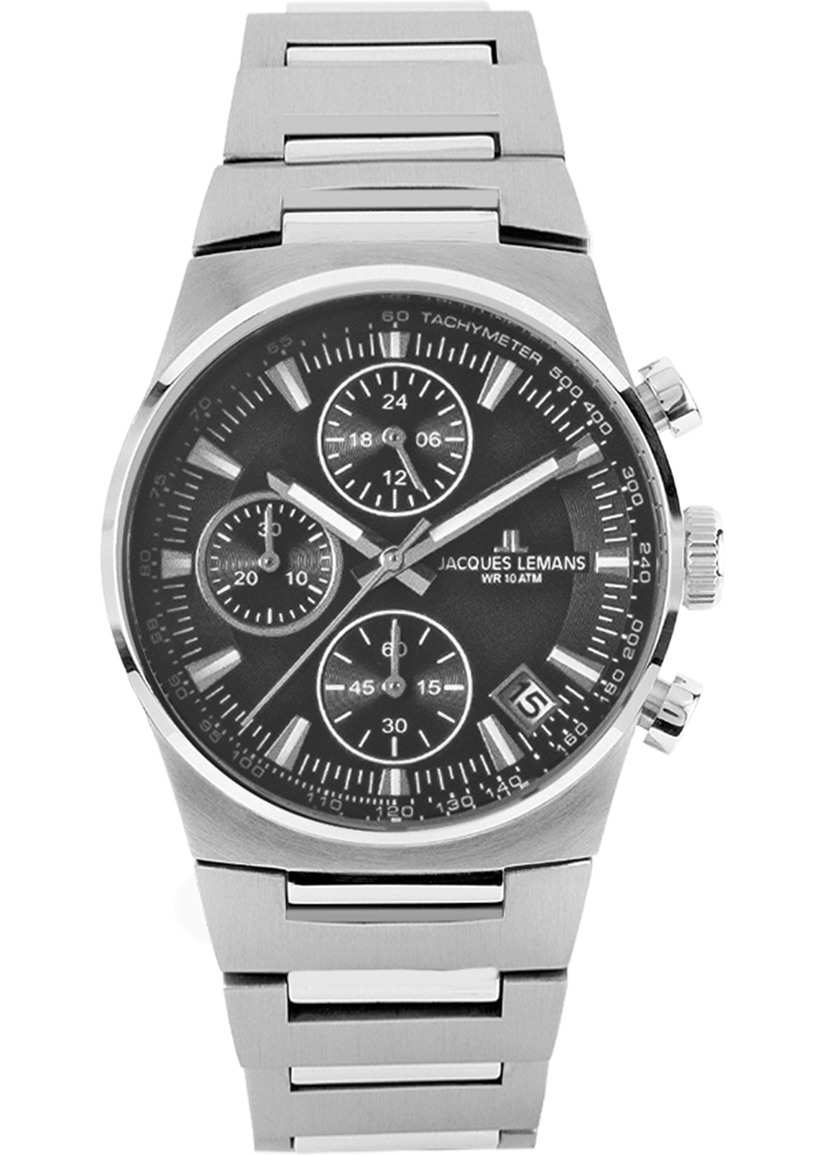 Das Damen – Modell 1-1738A aus der Serie Manchester von Jacques Lemans ist ein Chronograph mit dezent sportlicher Note. Das schwarze Zifferblatt besticht durch schlichte Indexes und schroe¤g gesetztes Datum zwischen 4 und 5 Uhr. Die Chronoringe mit 24-Stundenanzeige, Sekunden- und Minutenzoe¤hler und Stoppfunktion sind ein schoener Blickfang. Das Gehoe¤use aus massiv Edelstahl mit einem Durchmesser von 36mm betont die klassische Sportlichkeit dieser Uhr. Das Modell hat ein Quarzwerk, gehoe¤rtetes Crystex Glas, einen runden, verschraubten Gehoe¤useboden und eine Wasserdichtigkeit bis 10ATM. Das Metallband aus massiv Edelstahl mit Druecker und Sicherheitsbuegel unterstreicht die edle Aufmachung – dieser Zeitmesser ist die perfekte Kombination aus schlichter Eleganz und femininer Sportlichkeit.
