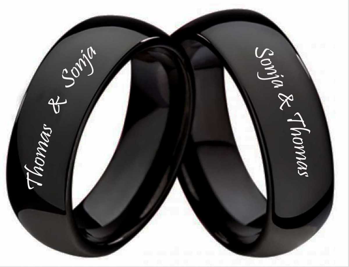 Massive und schlichte Ringe Diese Wolframringe sind aus einem Guss hergestellt und werden mit einem Laser nach Ihren Wuenschen, innen wie aussen, graviert. Die Ringe sind schlicht und abgerundet, was einen schoenen Look ergibt. Die Breite der Ringe ist 7mm und sie sind mit einer schwarzen Beschichtung ueberzogen. Im Lieferumfang sind die Gravuren, ein Etui und der Versand innerhalb von Deutschland inklusive. Diese Ringe koennen als Partnerringe, Verlobungsringe, Freundschaftsringe oder auch als Eheringe getragen werden. Diese Wolframringe mit sind schwarz Beschichtet und werden mit gratis Gravur geliefert auf Wunsch. Ringmodell: W108 Marke: Rings-and-More Ringmaterial: Wolfram Massiv: JA Beschichtet: schwarz Ringbreite Dame: ca. 7,0 mm Ringbreite Herr: ca. 7,0 mm Oberflaeche: mattiert Innen: bombiert (abgerundet) Oberflaeche innen: poliert Damenringgroessen: 50 bis 70 mm (nur in 2er Schritten verfuegbar) Herrenringgroessen: 50 bis 70 mm (nur in 2er Schritten verfuegbar) Lieferumfang : 1 Paar (1x Damenring und 1 x Herrenring) mit gratis Etui