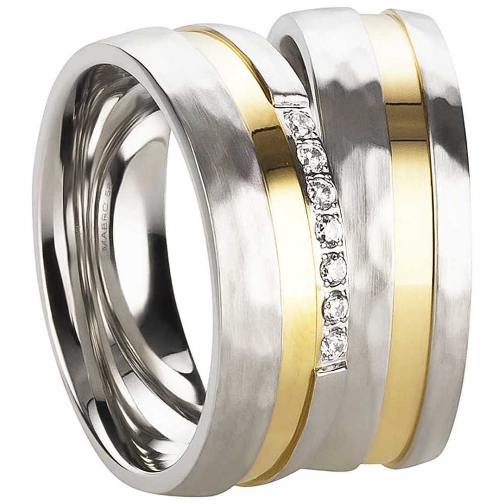 Fulminant schoene Partnerringe mit gratis Gravur und sieben Zirkonias In diesen wunderschoenen Damenring sind insgesamt sieben weisse runde Zirkonias eingefasst. Diese Steine haben jeweilss eine Groesse von etwa 1,5mm. Der Herrenring ist ohne Stein. Auf der Ringaussenflaeche ist teilweise eine goldfarbene Beschichtung eingearbeitet. Diese Oberflaeche aussen ist mattiert und auf der Innenseite sind die massiven Edelstahlringe bombiert und poliert. Die Ringbreite betraegt etwa 7,0 mm. Eine persoenliche Benachrichtigung kann kostenfrei durch eine Lasergravur auf der Ringinnenflaeche angebracht werden. Der Versand erfolgt in einer edlen schwarzen gratis Box und ist innerhalb von Deutschland umsonst. Ringmodell: AB3212-AB3213 Marke: Mabro Ringmaterial: Edelstahl Beschichtet: goldfarbig Ringmaterial massiv: JA Ringbreite Dame: ca. 7,0 mm Ringbreite Herr: ca. 7,0 mm Steinbesatz im Damenring: Zirkonia Steinform: rund Steinanzahl: 7 Steingroesse: ca. 1,5mm Oberflaeche: mattiert und poliert Oberflaeche innen: poliert Innen: bombiert (abgerundet) Damenringgroessen: 50 bis 62mm (nur in 2er Schritten verfuegbar) Herrenringgroessen: 56 bis 70mm (nur in 2er Schritten verfuegbar) Lieferumfang: 1x Paar (1x Damenring und 1 x Herrenring) und gratis Etui