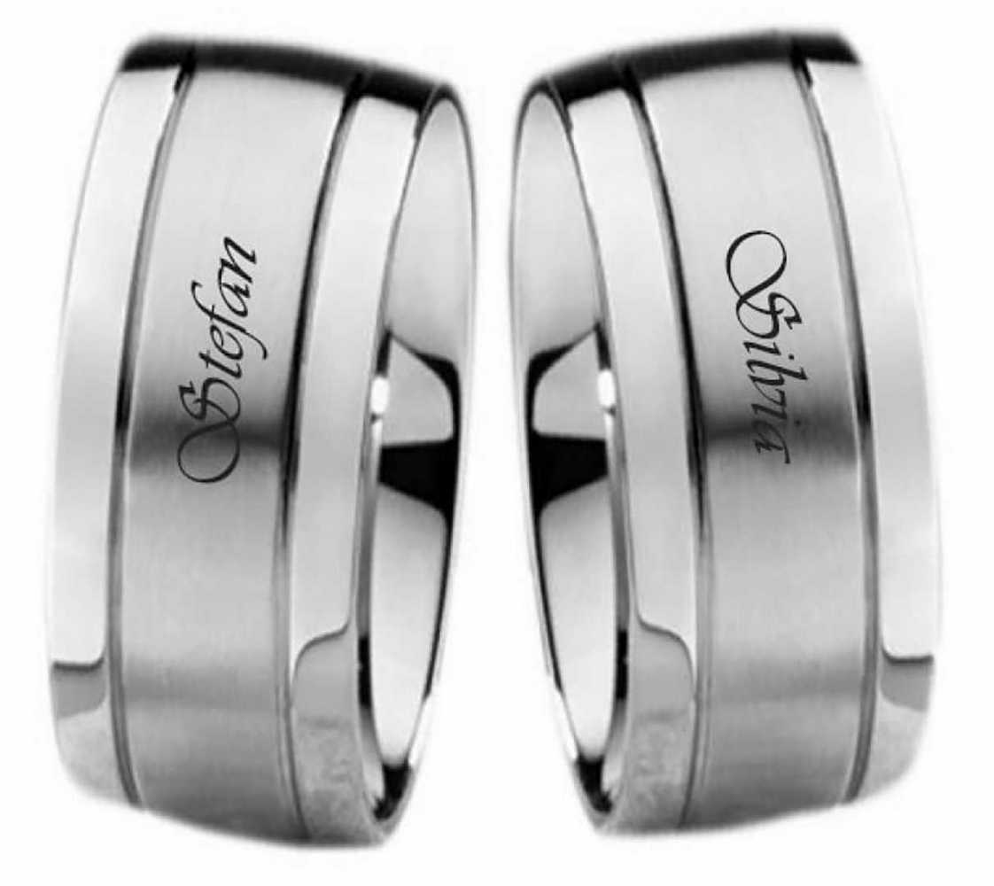 Moderne Verlobungsringe mit Aussengravur Diese Edelstahlringe aus dem Hause Rings-and-More sind 12mm breit. Dadurch dass die Innenseite bombiert/ abgerundet ist, ist das Tragegefuehl sehr hochwertig. Die Aussenflaeche sticht durch die mattierte und polierte Optik, sowie durch zwei zusaetzliche Glanzrillen sofort ins Auge. Die Oberflaeche innen ist poliert. Auf diesem Ring-Set kann man auf der Oberflaeche aussen eine Gravur anbringen lassen, ganz nach seinem Geschmack. Dabei stehen sieben verschiedene Schriftarten zur Wahl. Diese Gravur ist selbstverstaendlich kostenlos. Die Ringe koennen als Freundschafts-, Partner-, Verlobungs- und Eheringe getragen werden. Der Versand innerhalb von Deutschland, sowie ein edles Etui sind im Preis enthalten. Ringmodell: PE300 Marke: Rings-and-More Ringmaterial: Edelstahl Ringmaterial massiv: JA Ringbreite Dame:ca. 12 mm Ringbreite Herr:ca. 12 mm Oberflaeche: mattiert und poliert Oberflaeche innen: poliert Innen: bombiert (abgerundet) Damenringgroessen: 50 bis 66mm (nur in 2er Schritten verfuegbar) Herrenringgroessen: 50 bis 66mm (nur in 2er Schritten verfuegbar) Lieferumfang: 1 Paar (1x Damenring und 1 x Herrenring) mit gratis Etui