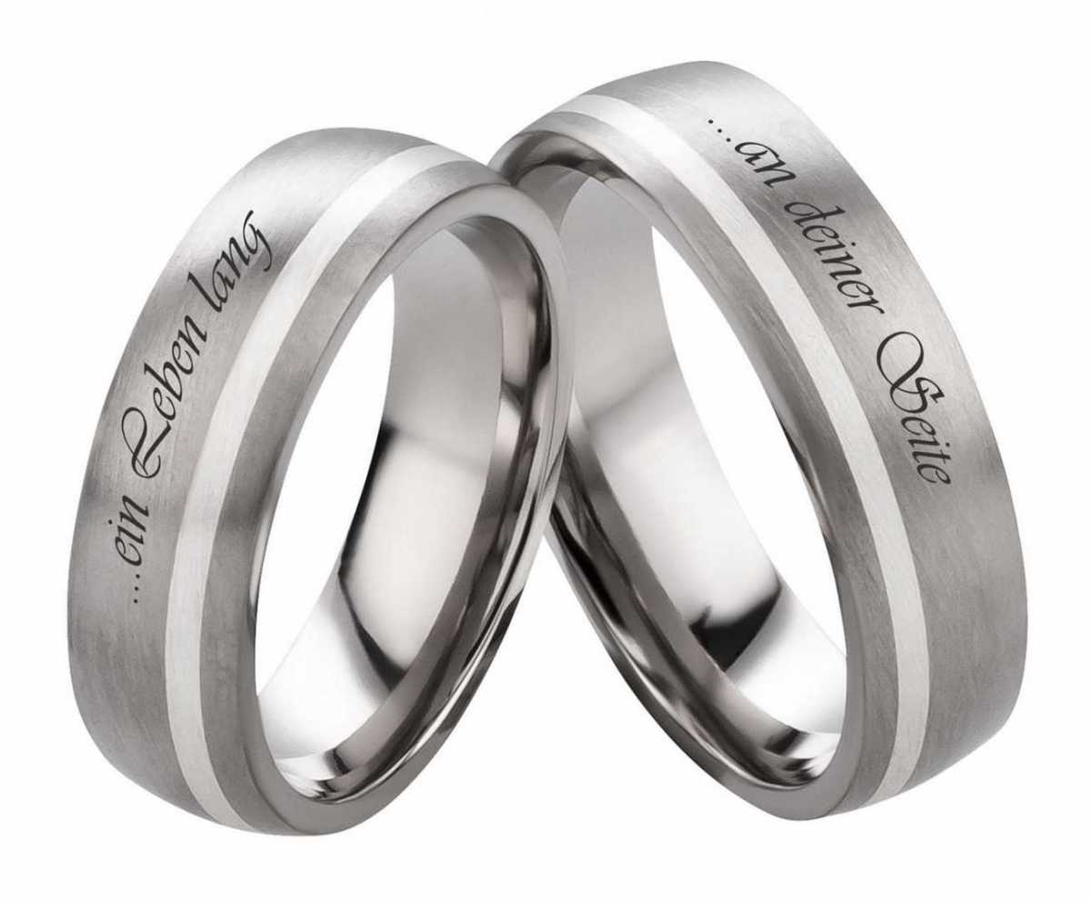 Zauberhafte Titanringe mit Silbereinlage und Aussengravur Durch die 925er-Silbereinlage auf der mattierten Aussenflaeche stechen diese Partnerringe aus Titan sofort ins Auge. Die Breite dieser Freundschafts- oder Trauringe betraegt 6,0 mm. Durch die Lasergravur, die man aussen anbringen lassen kann, wird die Verbundenheit der Traeger zusaetzlich zu Ausdruck gebracht. Dieses Zeichen der Liebe ist kostenfrei und kann mittels 30 Zeichen und sieben Schriftarten individuell formuliert werden. Die Innenseite der Titanringe ist poliert und abgerundet. Erfolgt der Versand innerhalb von Deutschland dann fallen keine zusaetzlichen Kosten an. Das Ring-Set wird schoen verpackt in einem edlen schwarzen gratis Etui zugeschickt. Ringmodell: PT004 Marke: Rings-and-More Ringmaterial: Titan mit 925 Silbereinlage Ringbreite Dame: ca. 6mm Ringbreite Herr: ca. 6mm Oberflaeche: mattiert Damenringgroessen: 47 bis 72 Herrenringgroessen: 47 bis 72 Lieferumfang: 1 Paar (1x Damenring und 1 x Herrenring) und gratis Etui