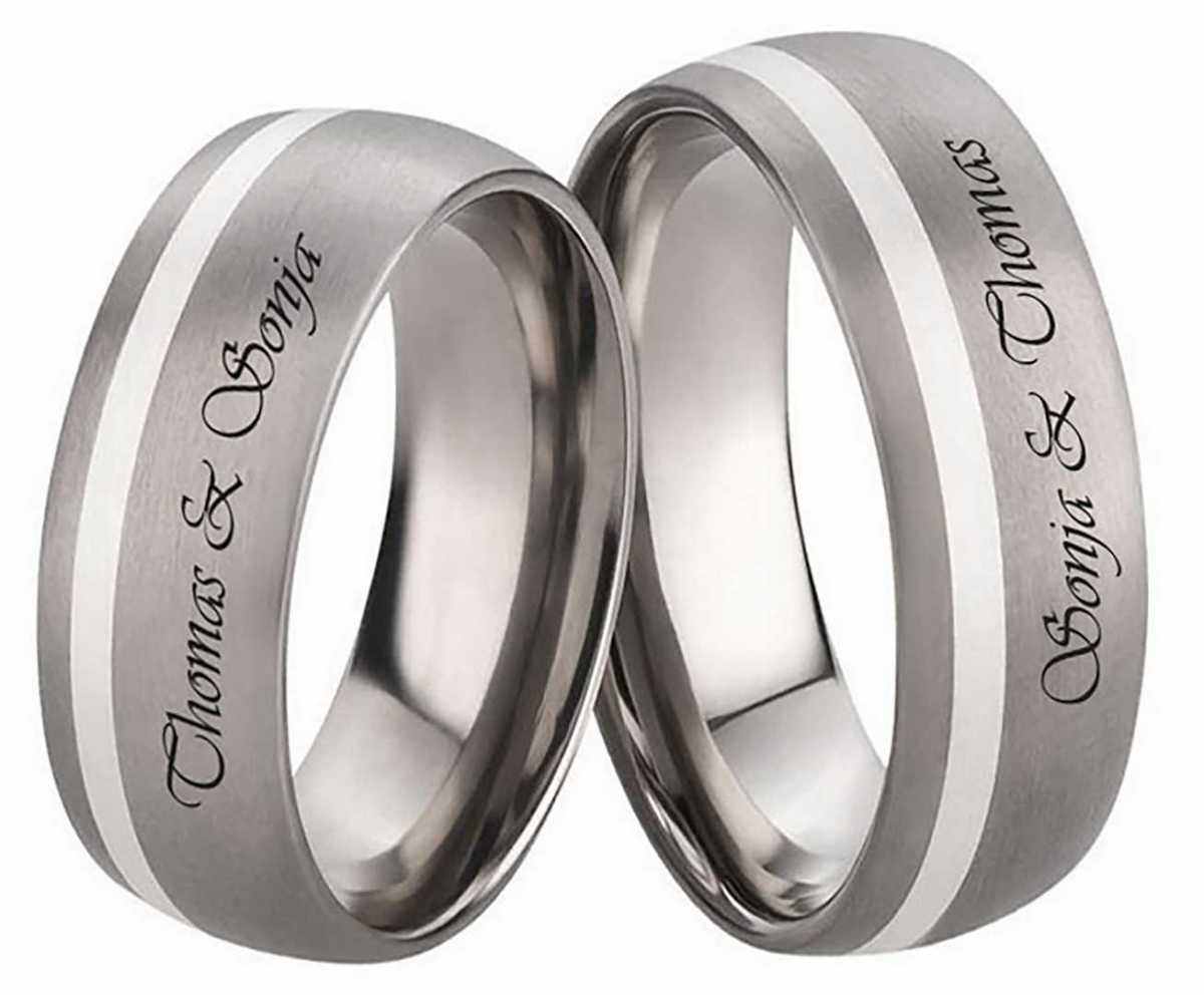 Ausgefallen schoene Titanringe mit Silbereinlage und Aussengravu Durch die 925er-Silbereinlage auf der mattierten Oberflaeche aussen stechen diese Partnerringe aus Titan sofort ins Auge. Zusaetzlich schmueckt die Aussenflaeche eine selbst formulierte gratis Gravur. Diese Botschaft stellt die Verbundenheit der Traeger dar. Man kann sie ganz nach den eigenen Wuenschen mit 30 Zeichen und sieben Schriftarten gestalten und durch einen Laser anbringen lassen. Die Titanringe, die als Verlobungs- oder auch als Eheringe getragen werden koennen haben eine Breite von 8,0 mm. Sicher aufbewahrt in einem gratis Etui werden diese Ringe verschickt. Die Versandkosten innerhalb von ganz Deutschland ist im Angebot selbstverstaendlich schon enthalten. Ringmodell: PT046 Marke: Rings-and-More Ringmaterial: Titan mit Silbereinlage Ringbreite Dame: ca. 8mm Ringbreite Herr: ca. 8mm Oberflaeche: mattiert Damenringgroessen: 50 bis 72 Herrenringgroessen: 50 bis 72 Lieferumfang: 1 Paar (1x Damenring und 1 x Herrenring) und gratis Etui