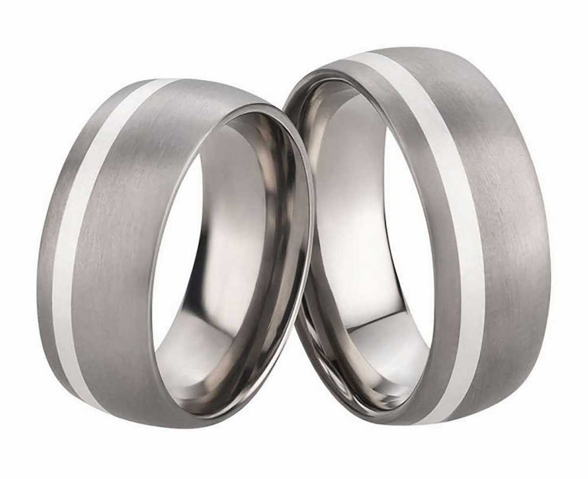 Gravierbare Titanringe mit edler Silbereinlage Moechten Sie Partnerringe mit einer hochwertig eingearbeiteten Silbereinlage, dann sind diese Titanringe aus dem Hause Rings-and-More die perfekte Wahl. Diese verziert ganz zauberhaft die mattierte Oberflaeche. Auf der Innenseite, die poliert und abgerundet ist, ist eine gratis Gravur vorgesehen. Diese wird durch einen Laser gratis angebracht. Mit diesem Hinweis werden die Verlobungs- oder Trauringe zu Ringen fuer die Ewigkeit und verbindet die beiden Traeger fuer den Rest ihres Lebens. Die Botschaft kann ganz individuell formuliert werden. Beide Ringe sind 8,0 mm breit und werden in einem edlen Etui in Schwarz zugeschickt. Die Kosten dafuer sind innerhalb von Deutschland im Angebot schon enthalten. Ringmodell: PT071 Marke: Rings-and-More Ringmaterial: Titan mit Silbereinlage Ringbreite Dame: ca. 8mm Ringbreite Herr: ca. 8mm Oberflaeche: mattiert Damenringgroessen: 50 bis 72 Herrenringgroessen: 50 bis 72 Lieferumfang: 1 Paar (1x Damenring und 1 x Herrenring)
