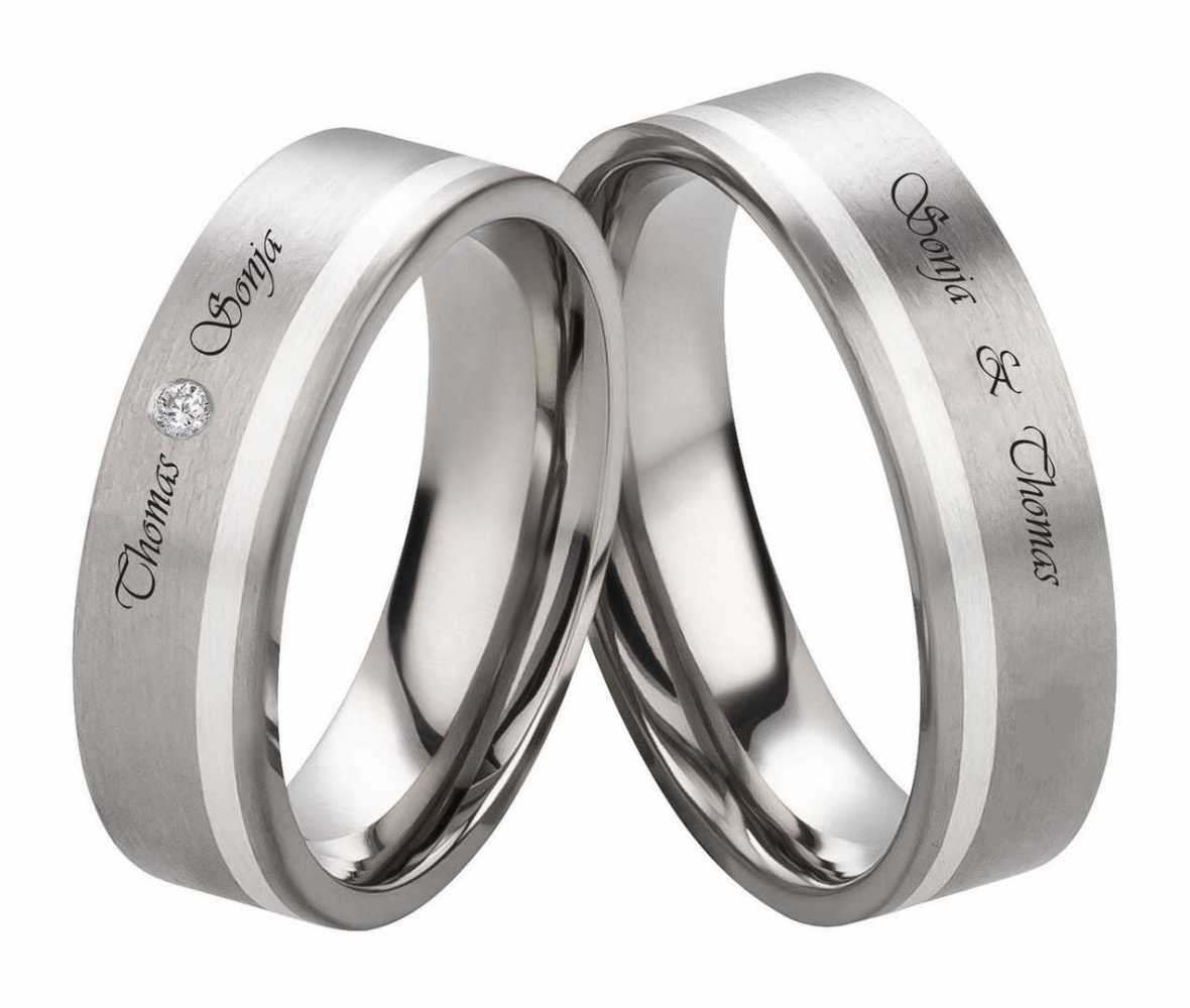 Maerchenhafte Titanringe mit Silbereinlage, Aussengravur und Zirkonia oder Diamant Diese Partnerringe aus Titan haben gleich mehrere Highlights. Zum einen haben sie auf der mattierten Aussenflaeche eine Silbereinlage eingearbeitet, zum anderen kann man eine gratis Gravur anbringen lassen und der Damenring hat zusaetzlich noch einen wunderschoenen runden 1,5mm grossen Zirkonia oder ein 0,02ct Diamant eingefasst. Mit diesen Titanringen treffen Sie Mitten ins Herz. Die Freundschafts- oder Trauringe haben eine Breite von 6mm. Die Gravur kann mittels eines Lasers angebracht werden und mit Hilfe von 30 Zeichen und sieben Schriftarten formuliert werden. Die Innenseite dieser Ringe ist bombiert und poliert. Fuer eine gute und sichere Aufbewahrung wird ein edles gratis Etui in Schwarz mitgeliefert. Die Versandkosten sind innerhalb von ganz Deutschland im Angebot enthalten. Ringmodell: PT079 Marke: Rings-and-More Ringmaterial: Titanmit Silbereinlage Material: Massiv Ringbreite Dame: ca. 6mm Ringbreite Herr: ca. 6mm Steinbesatz im Damenring: Zirkonia oder Diamant Steingroesse: ca.1,5mm oder 0,02ct W/Si Steinanzahl: 1 Oberflaeche: Gebuerstet Damenringgroessen: 50 bis 72 Herrenringgroessen: 50 bis 72 Lieferumfang: 1 Paar (1x Damenring und 1 x Herrenring)
