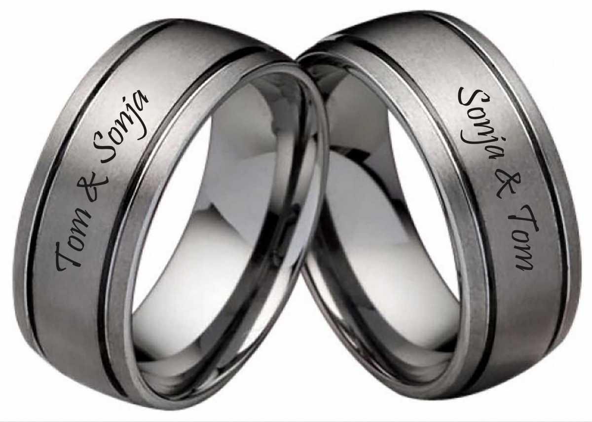 Dekorative Wolframringe mit gratis Aussengravur und zwei Glanzrillen Die Optik dieser Partnerringe aus Wolfram ist durch die beiden Glanzrillen auf der mattierten Oberflaeche ein absoluter Blickfang. Zusaetzlich kann man diese Ehe- oder Freundschaftsringe aussen gratis mittels eines Lasers gravieren lassen. Fuer diese sehr persoenliche Botschaft stehen sieben Schriftarten und 30 Zeichen zur Auswahl. Die Wolframringe haben eine Breite von 7,0 mm und werden in einem edlen gratis Etui verschickt. Die Innenseite ist poliert und abgerundet, wodurch eine gutes Fragegefuehl garantiert wird. Deutschlandweit fallen keine Kosten fuer den Versand an. Ringmodell: PW117 Marke: Rings-and-More Ringmaterial : Wolfram Ringmaterial : massiv Ringbreite Dame: ca. 7,0 mm Ringbreite Herr: ca. 7,0 mm Oberflaeche: mattiert Innen: bombiert (abgerundet) Innenseite: poliert Damenringgroessen: 50 bis 68mm (nur in 2er Schritten verfuegbar) Herrenringgroessen: 50 bis 68mm (nur in 2er Schritten verfuegbar) Lieferumfang : 1x Paar (1x Damenring und 1 x Herrenring) und gratis Etui