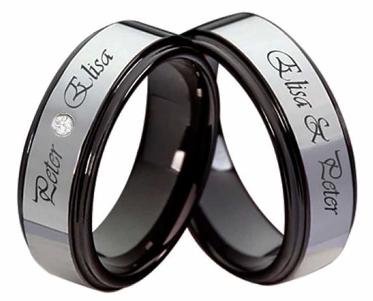 Prachtvolle Wolframringe mit Zirkonia und Aussengravur Ein wahrer Blickfang sind diese Partnerringe aus Wolfram. Sie stechen durch ihre teilweise schwarz beschichtete und polierte Oberflaeche sofort ins Auge. Der Damenring faellt zusaetzlich durch den funkelnden eingefassten runden Zirkonia auf. Dieser Stein hat eine Groesse von 1,5mm. Die Trau- oder Freundschaftsringe haben eine Breite von 7,0 mm und sind durch die abgerundete Innenseite sehr angenehm zu tragen. Die Innenflaeche ist Hochglanz poliert. Auf der Oberflaeche aussen ist eine gratis Gravur vorgesehen, die jeder ganz individuell formulieren und gestalten kann. Es stehen dafuer sieben Schriftarten und 30 Zeichen zur Verfuegung, um die richtige Botschaft der Liebe oder Freundschaft in Worte zu fassen. Geliefert werden die Wolframringe in einem edlen gratis Etui und ist deutschlandweit kostenfrei. Ringmodell: PW120 Marke: Rings-and-More Ringmaterial : Wolfram Ringmaterial : massiv Beschichtet: schwarz Ringbreite Dame: ca. 7,0 mm Ringbreite Herr: ca. 7,0 mm Steinbesatz im Damenring: Zirkonia Steingroesse: ca.1,5mm Oberflaeche: poliert Innen: bombiert (abgerundet) Innenseite: poliert Damenringgroessen: 47 bis 68mm (nur in 2er Schritten verfuegbar) Herrenringgroessen: 47 bis 68mm (nur in 2er Schritten verfuegbar) Lieferumfang : 1x Paar (1x Damenring und 1 x Herrenring) und gratis Etui